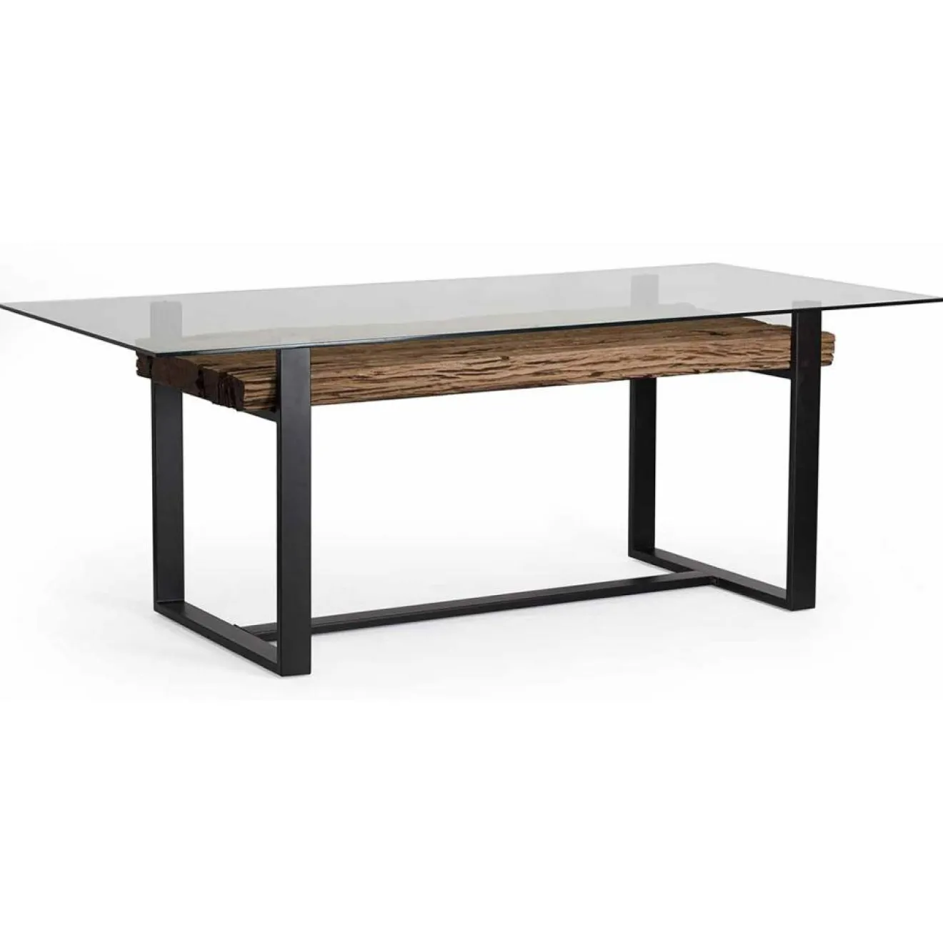 Le plateau en verre vient parfaire le design en apportant une touche de sophistication, créant un contraste visuel intéressant avec la rusticité du bois recyclé