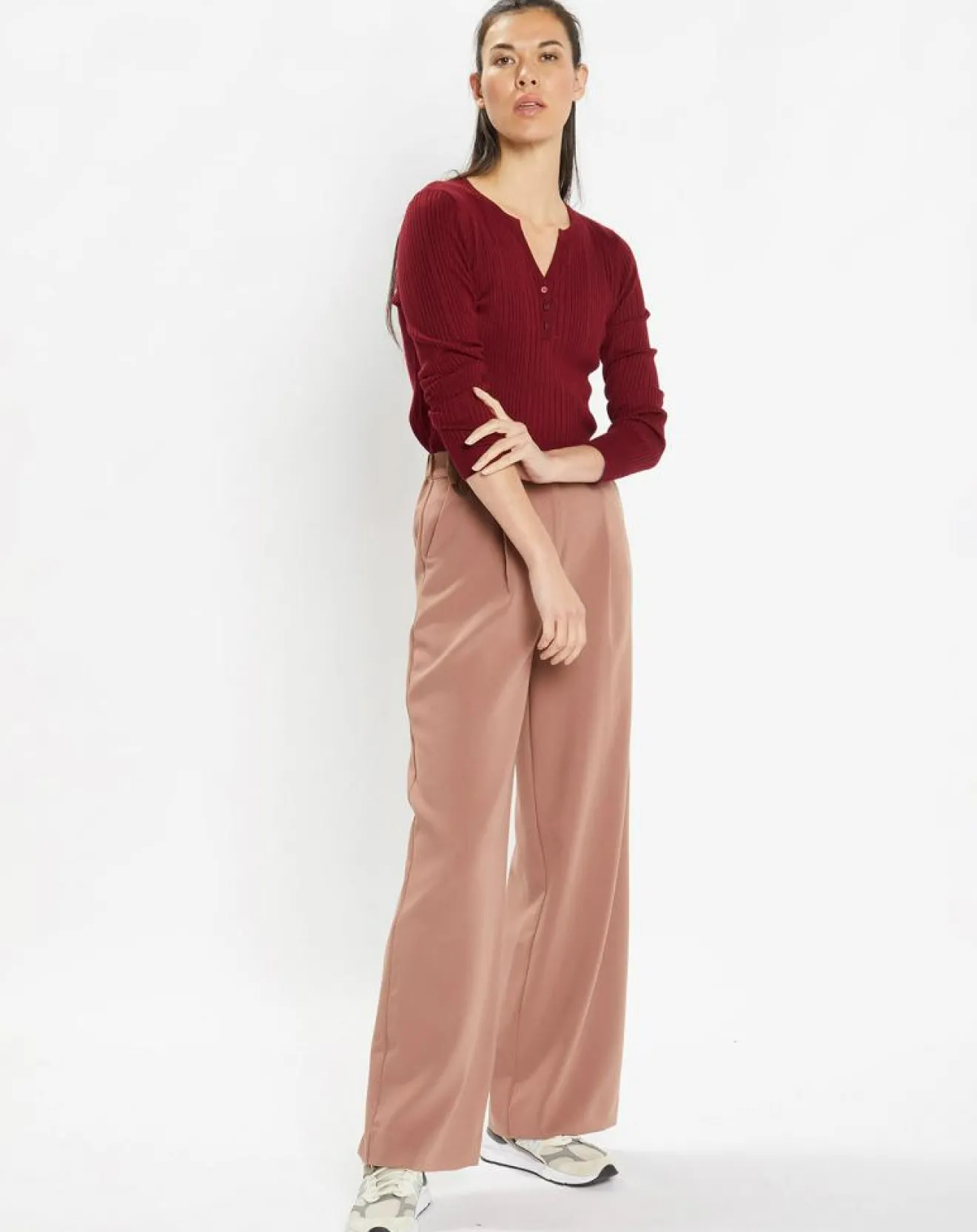 Ce pull ajusté Galeries Lafayette en maille stretch côtelée est muni d’un col tunisien boutonné ainsi que de manches longues.
