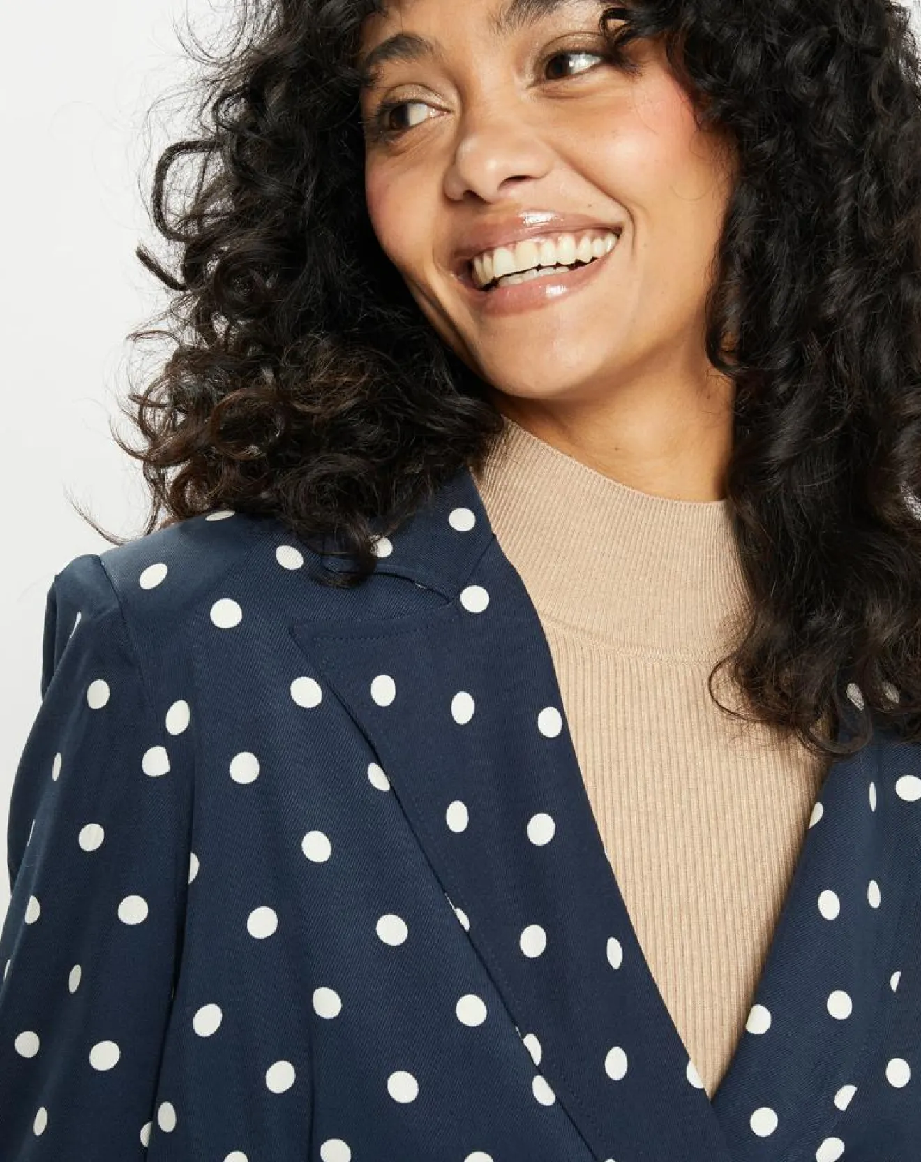 Cette veste fluide Jodhpur confectionnée en coton stretch dispose d’un imprimé uni, à pois ou floral selon le coloris, d’un col cranté, d’une double patte de boutonnage croisée, de 2 poches à rabat ainsi que d’une fente d’aisance au dos.