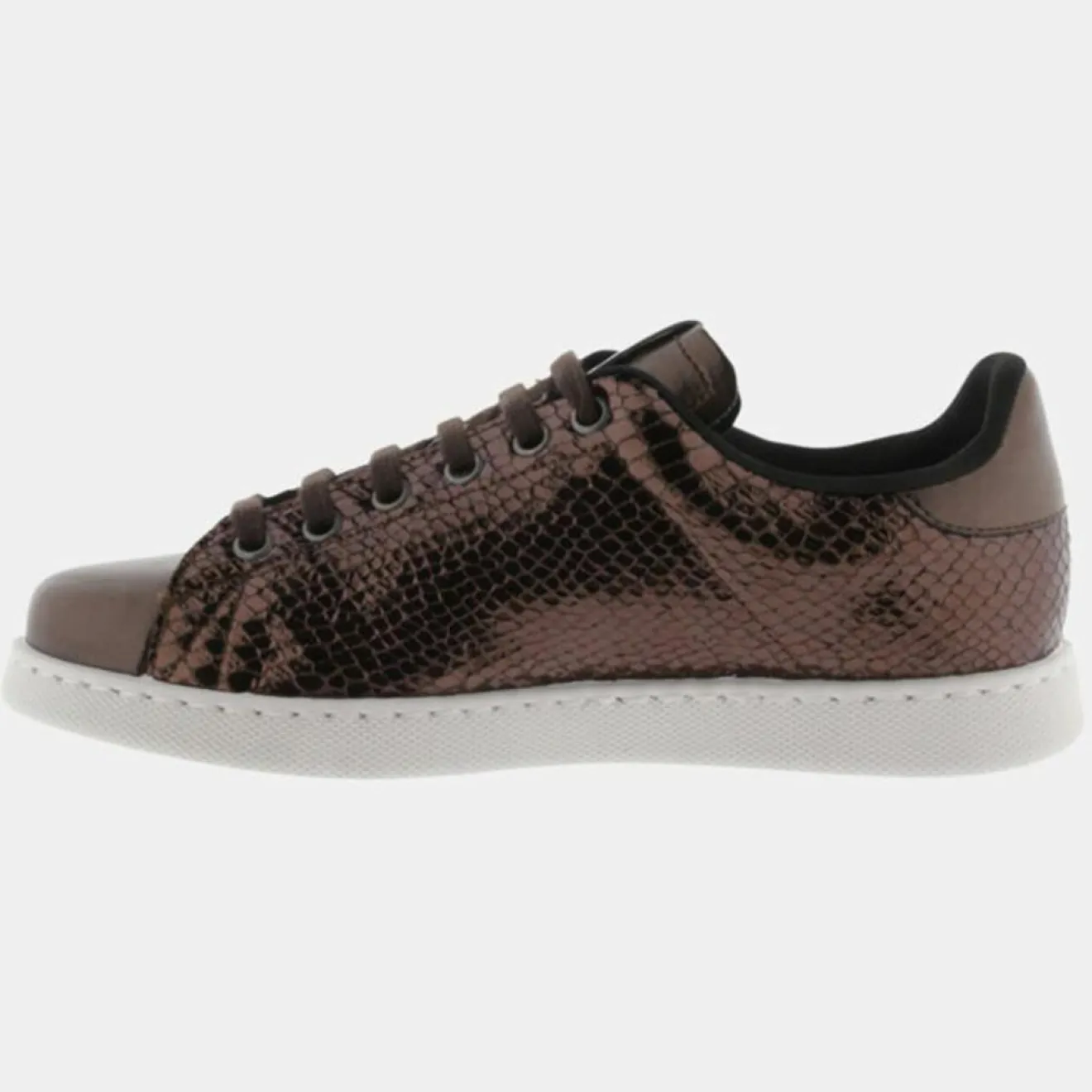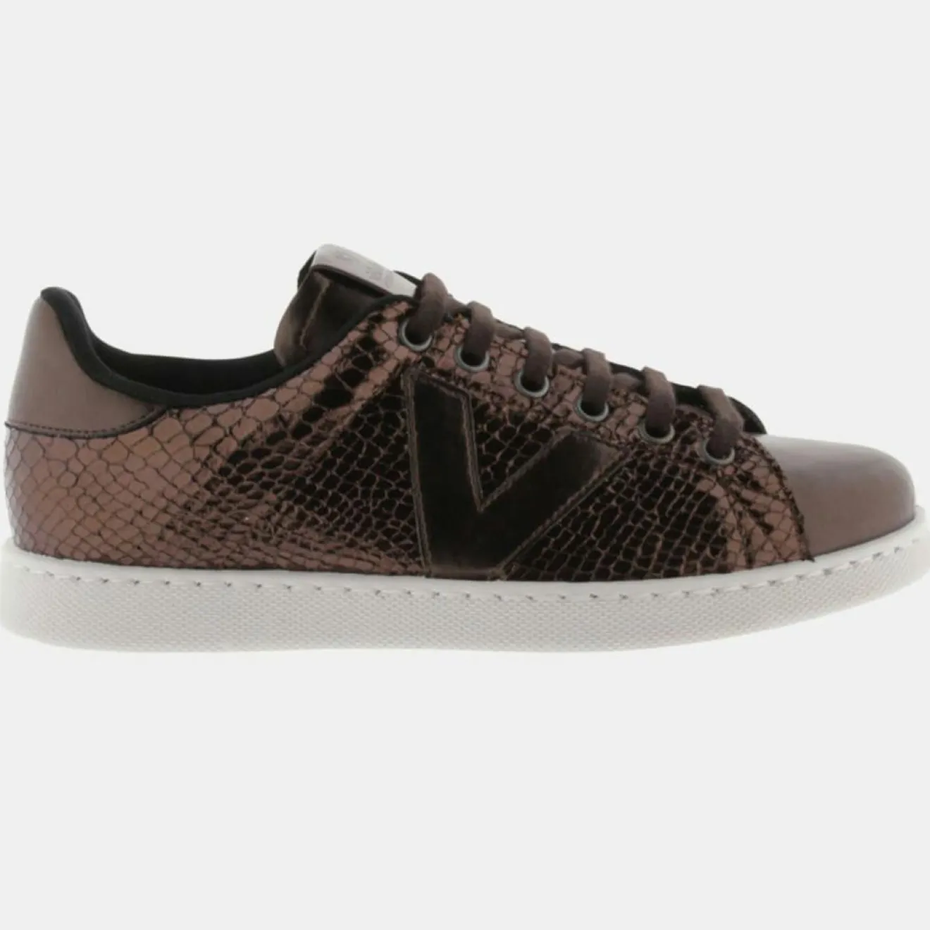 Ces baskets basses Victoria en matière enduite vernis embossée serpent, sont dotées d’un bout arrondi, d’un laçage à 7 oeillets et d’une languette siglée.