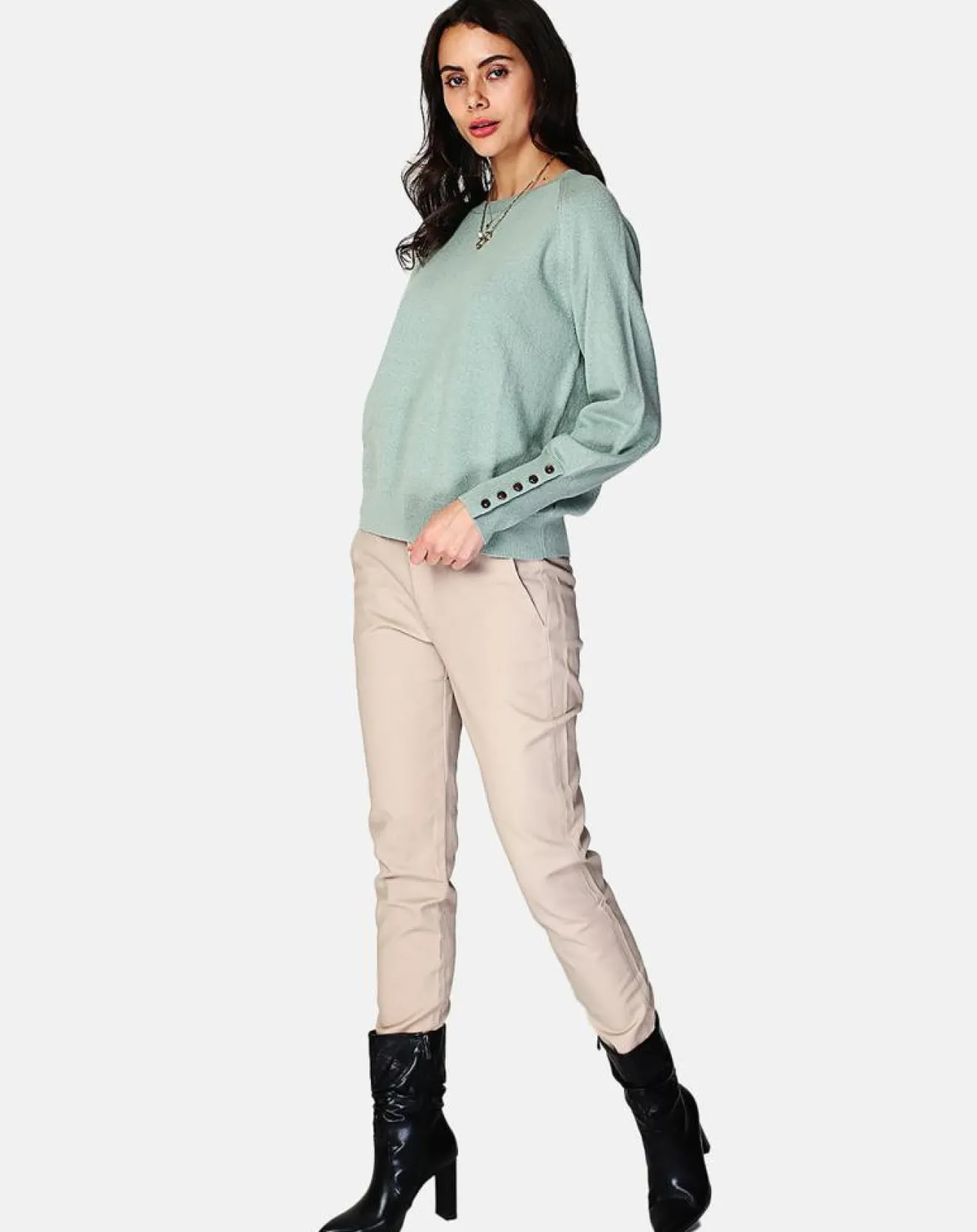 Pull large encolure ronde à manches longues légèrement ballon avec patte de boutonnage en bas de manche