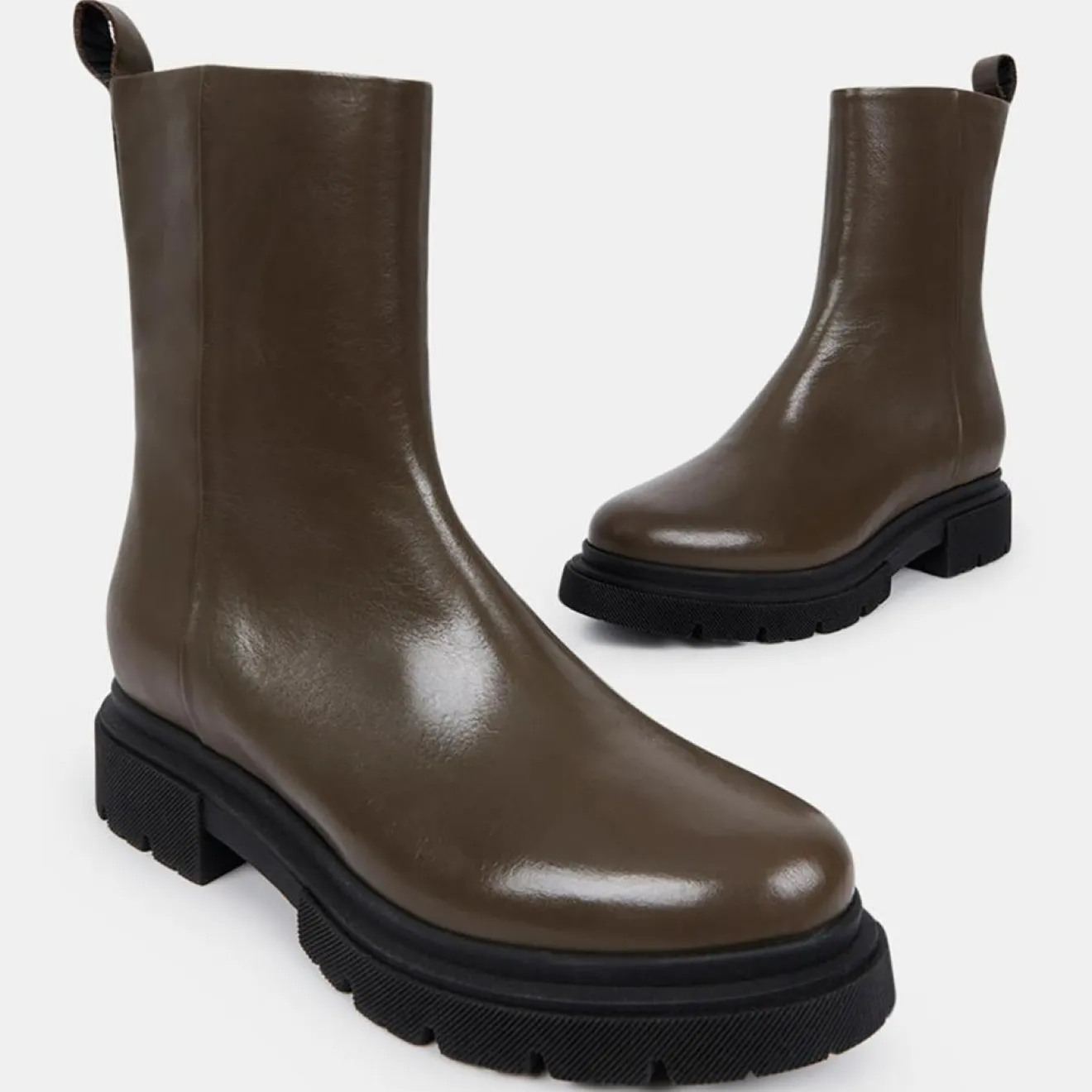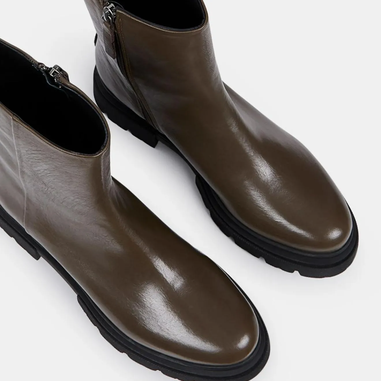 Ces boots Galeries Lafayette confectionnées en cuir de vachette lisse, proposent un bout rond, une fermeture zippée, un tirant d’enfilage ainsi qu’un tour de cheville élargie. La première de propreté est en cuir et la semelle extérieure est en gomme.