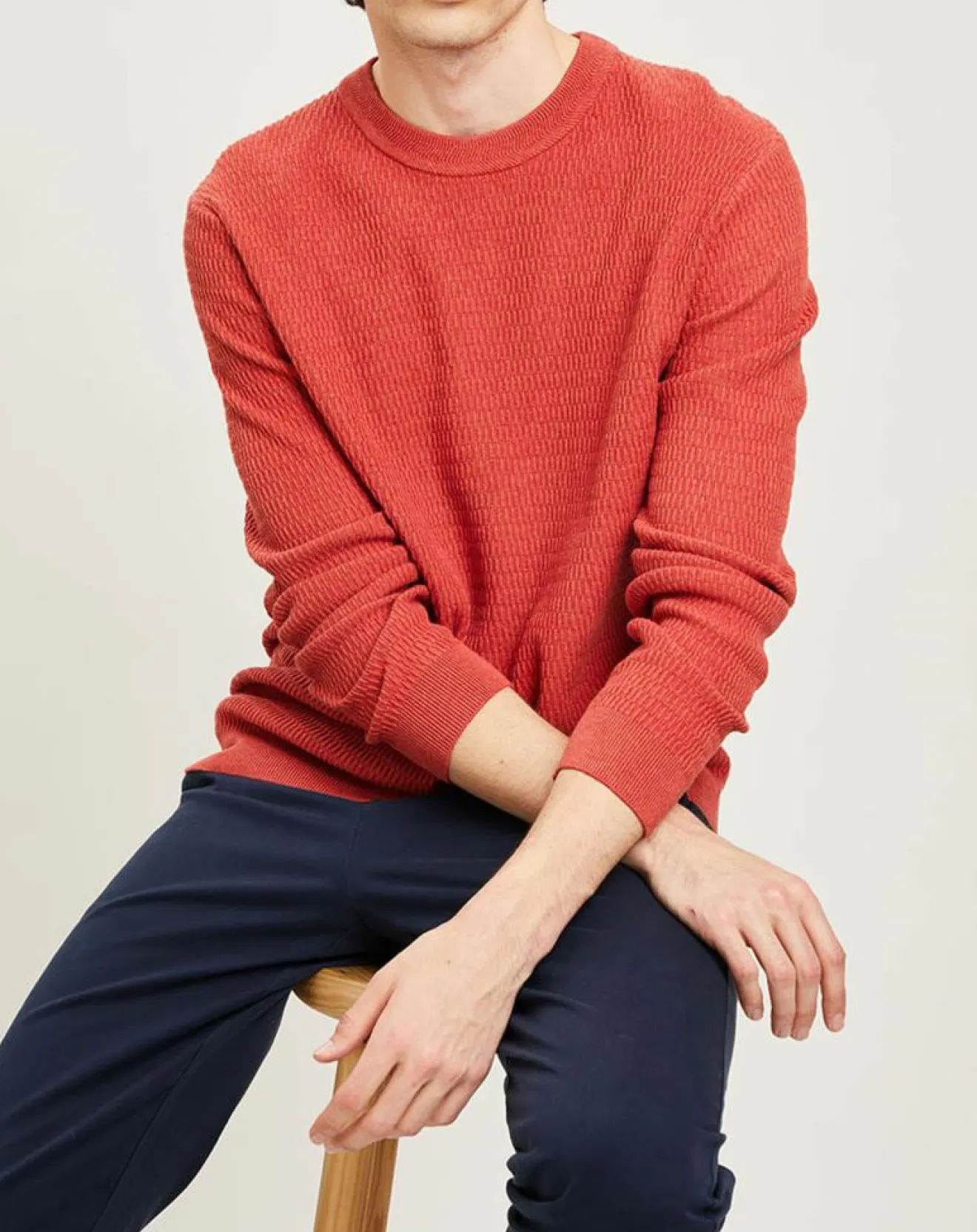 Cette pièce se distingue par sa maille texturée et sa couleur chaude brique chinée.