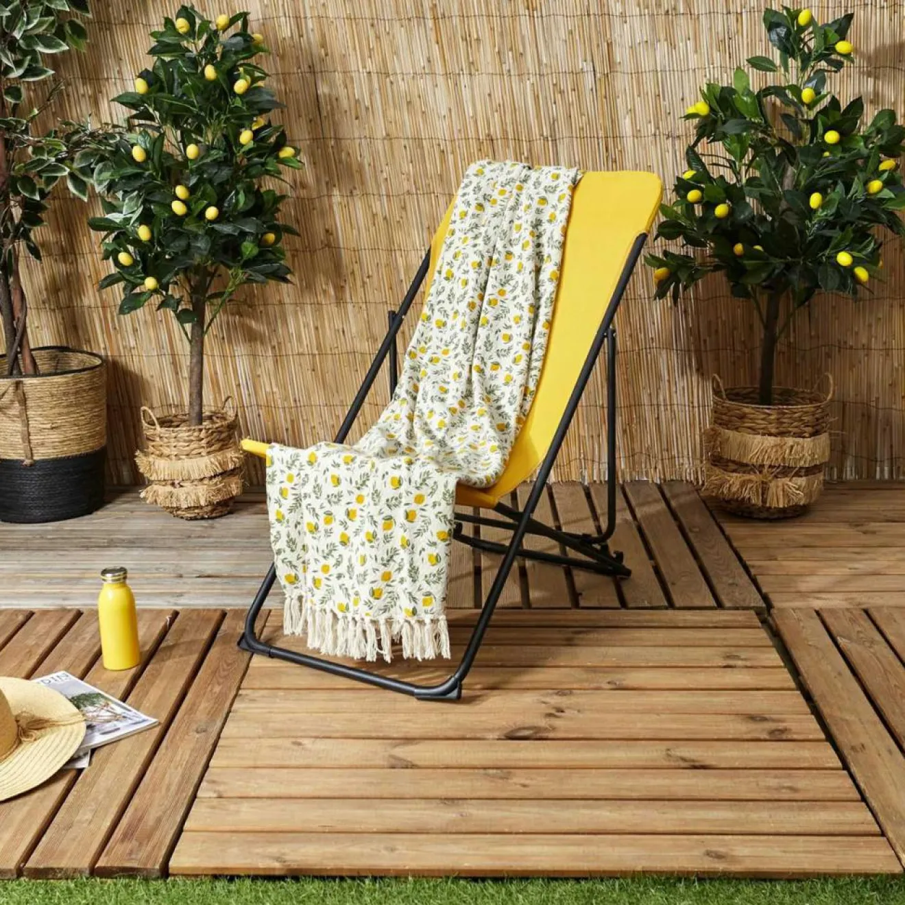 Illuminez vos moments de détente avec le plaid à franges Bain de Soleil de 120 x 150 cm. Conçu pour compléter parfaitement votre décor estival, ce plaid présente un charmant motif de citron qui apporte une touche de chaleur et de gaieté à tout espace extérieur ou intérieur. Fabriqué une majorité de coton, il assure confort et légèreté, parfait pour se blottir lors des soirées plus fraîches d’été ou pour ajouter une couche de confort sur votre chaise longue préférée.