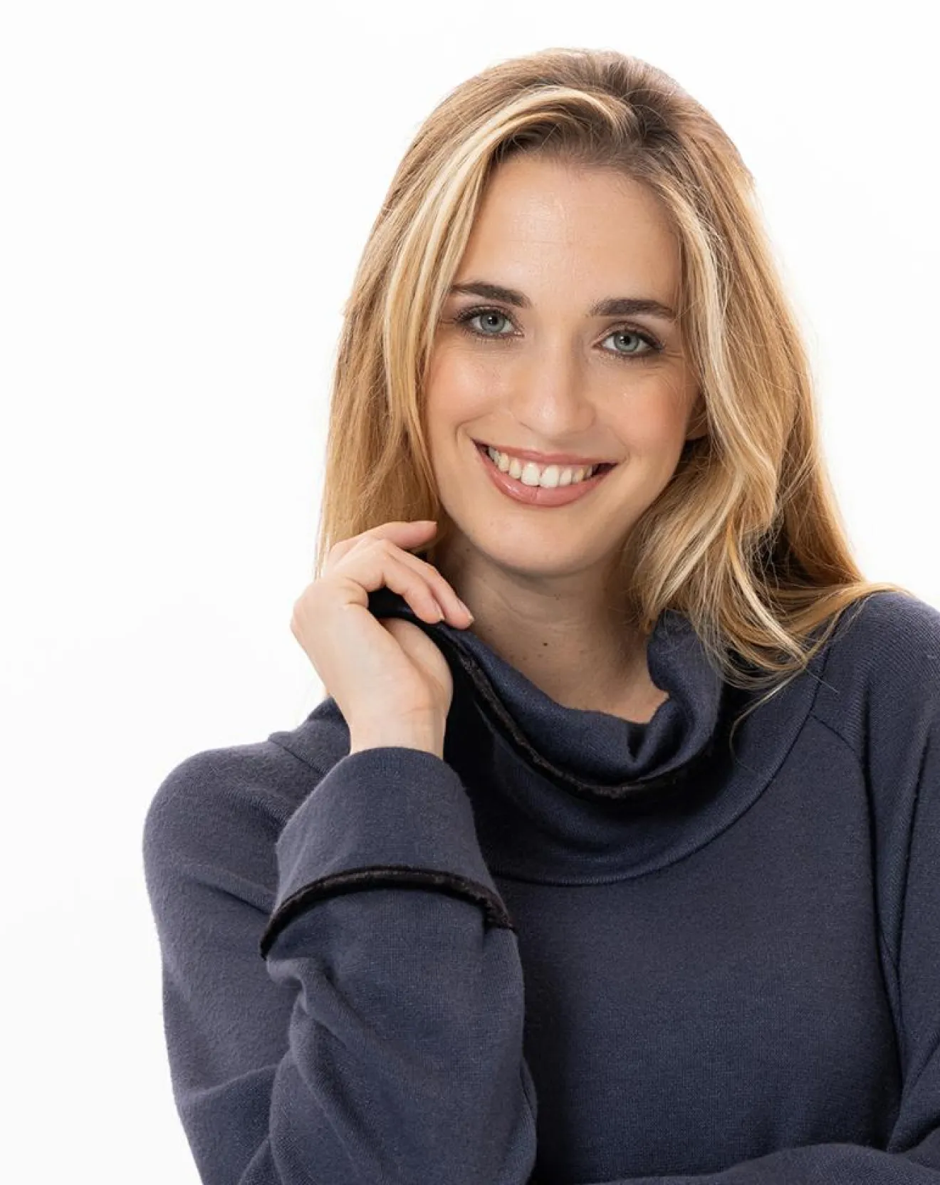Sa maille tricot est douce et douillette, ses volumes volontairement un peu amples pour des looks élégants et réconfortants.