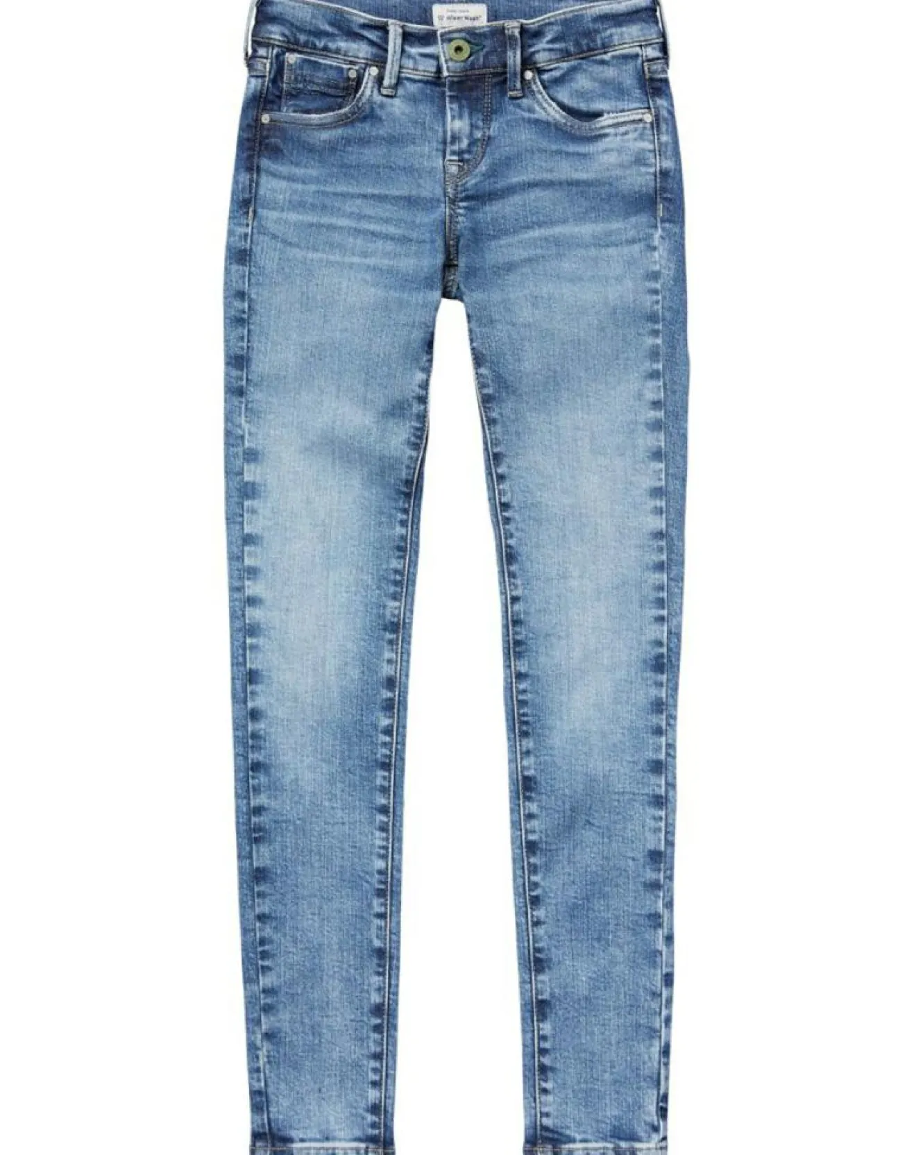 Jeans coupe skinny taille mi-haute Pepe Jeans bleu clair délavé en denim faible élasticité doté de 2 poches cavalières, d’une poche ticket et d’une fermeture rehaussée d’un bouton sur le devant.