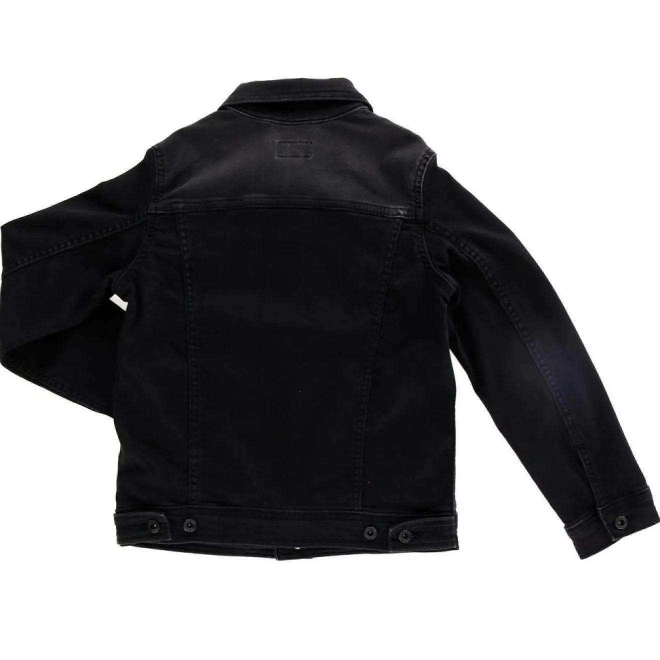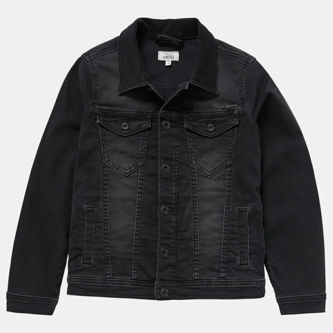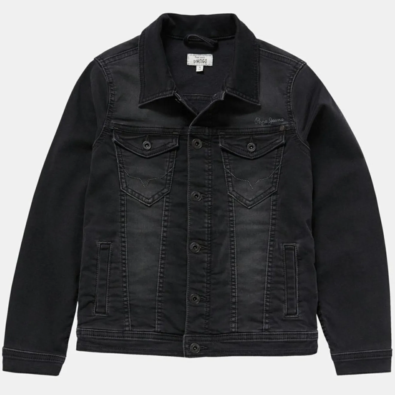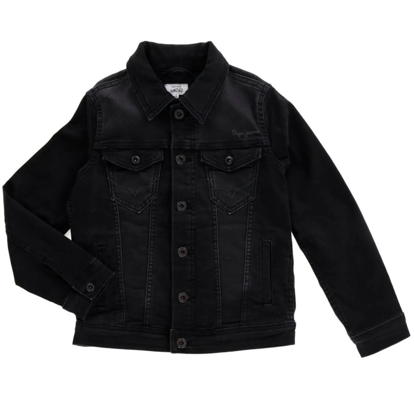 Cette veste droite et courte Pepe Jeans composée de coton denim noir présente un col classique, des manches longues, une fermeture boutonnée sur le devant et des poches latérales.