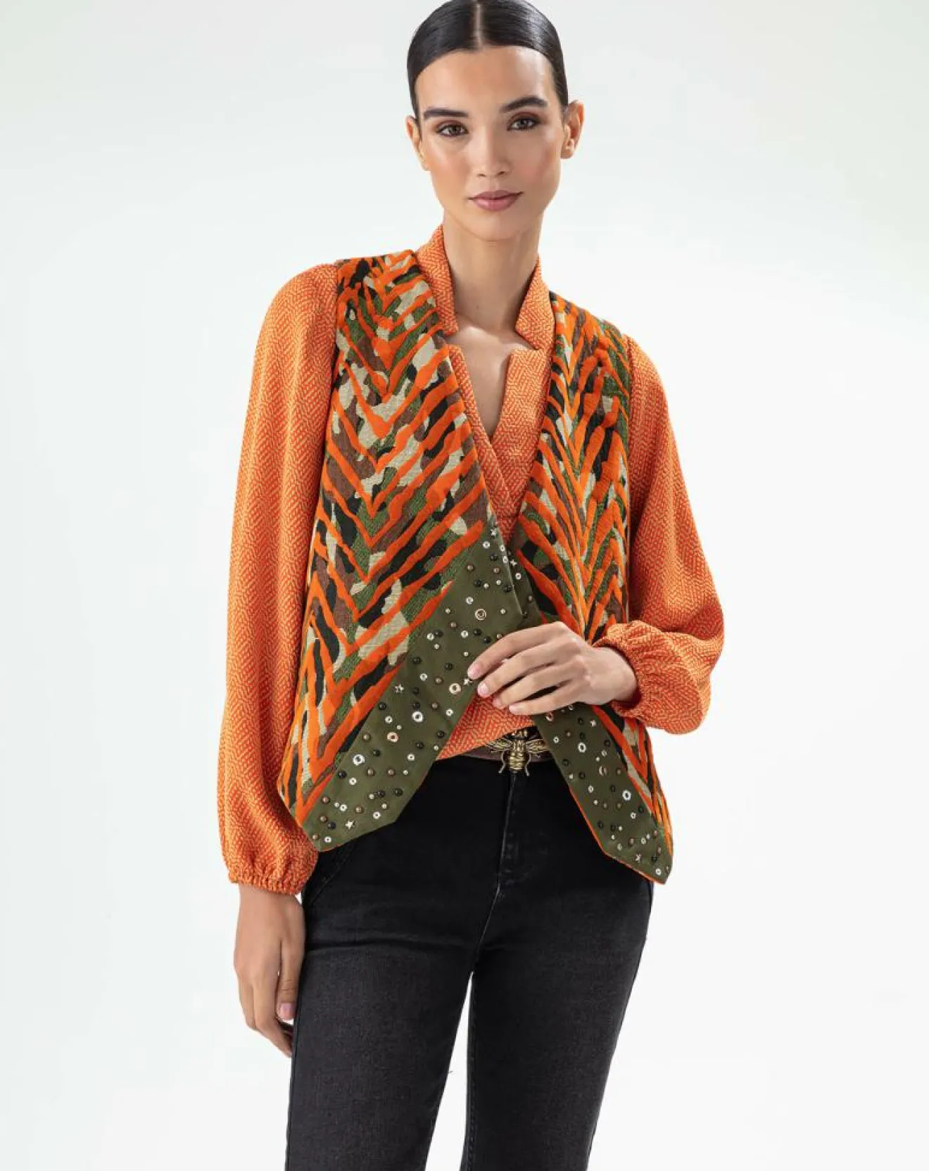 En jacquard orange et kaki zébré, vous l’associerez facilement à vos différentes blouses pour une tenue de soirée et à un col roulé noir pour un look plus décontracté