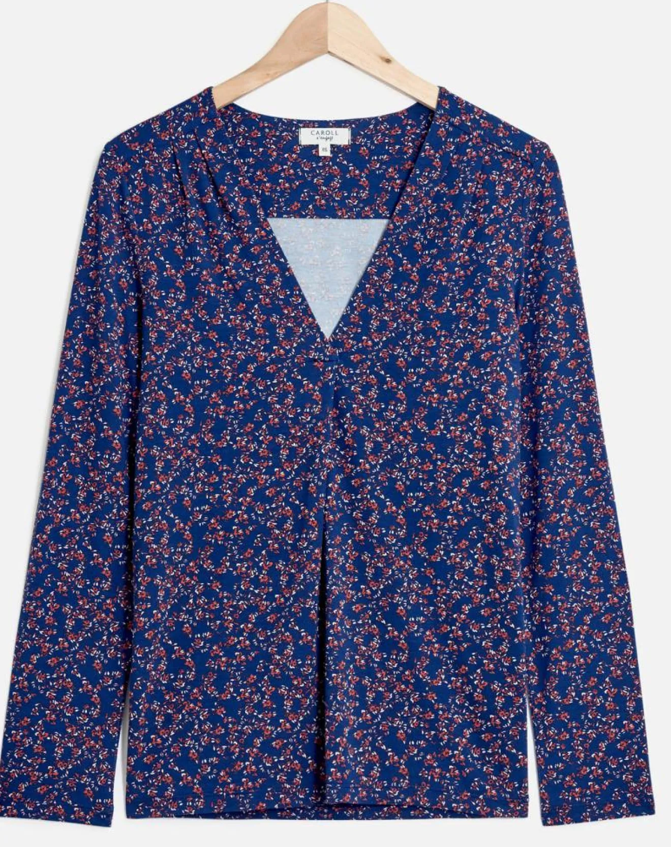 T-shirt orné d’un imprimé floral minimaliste, avec un col V féminin mettant en valeur la poitrine