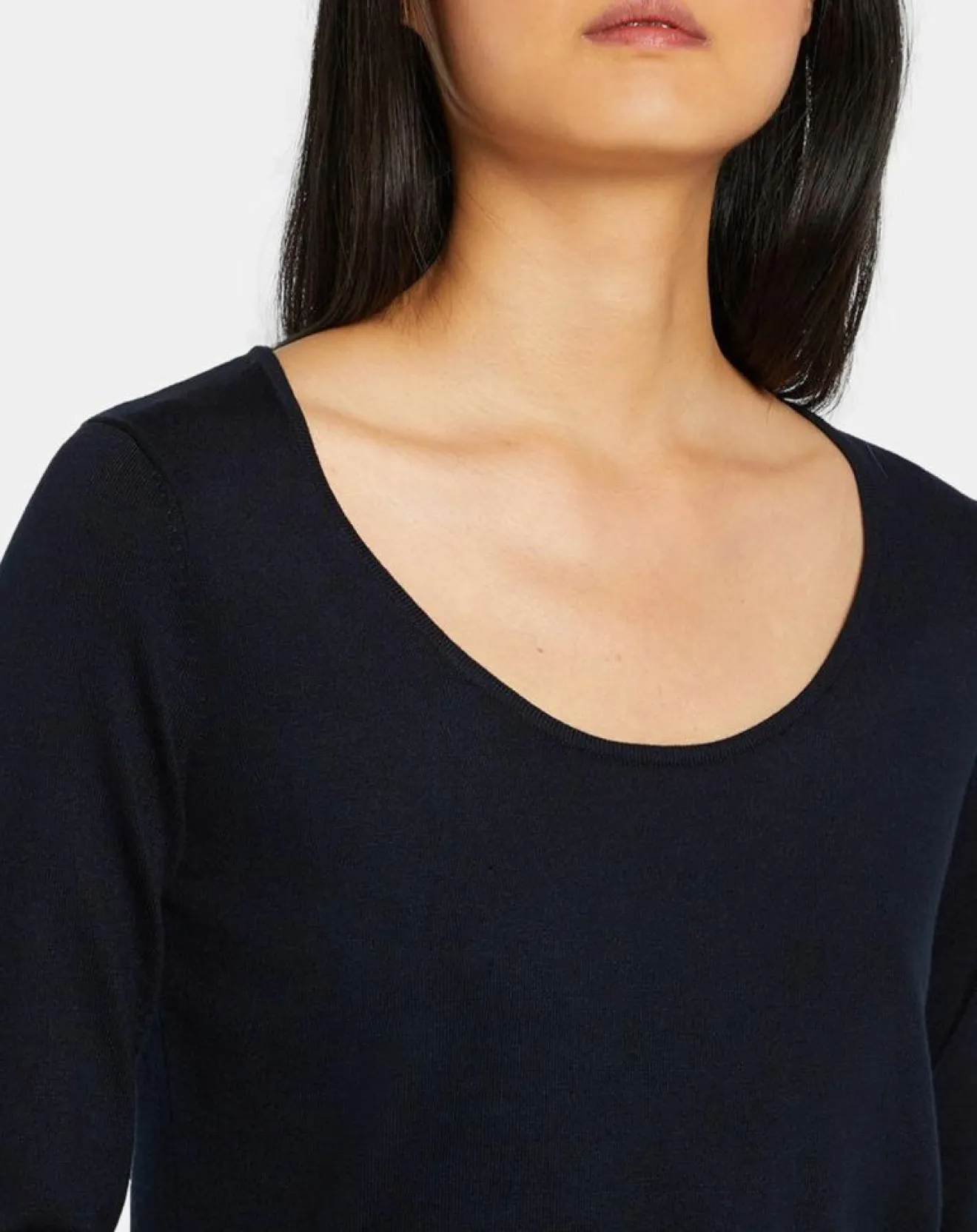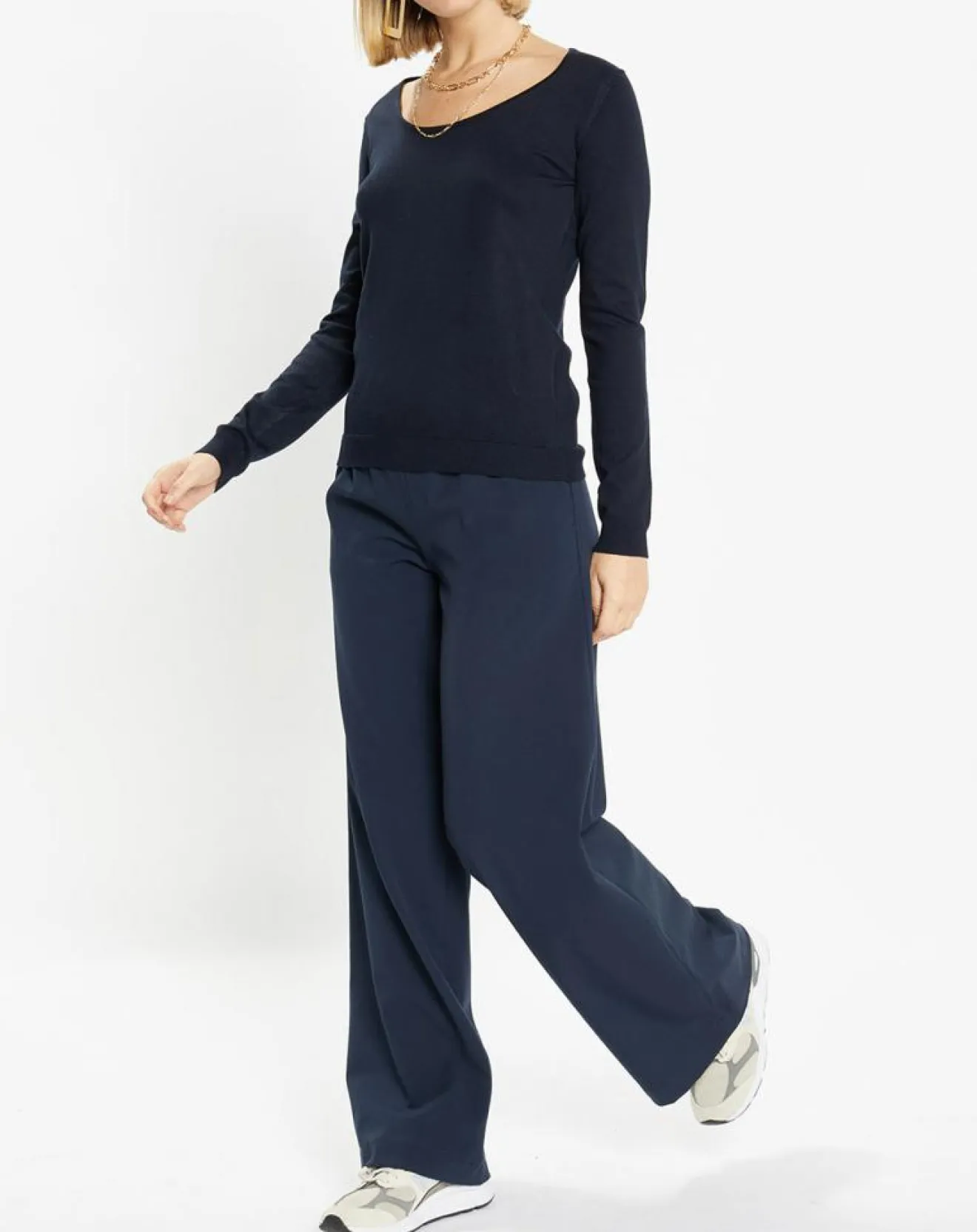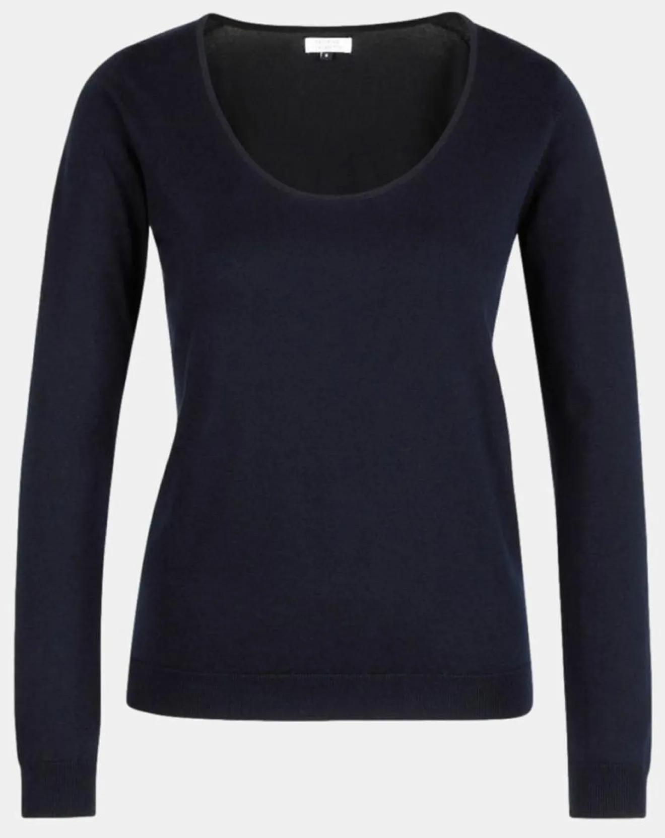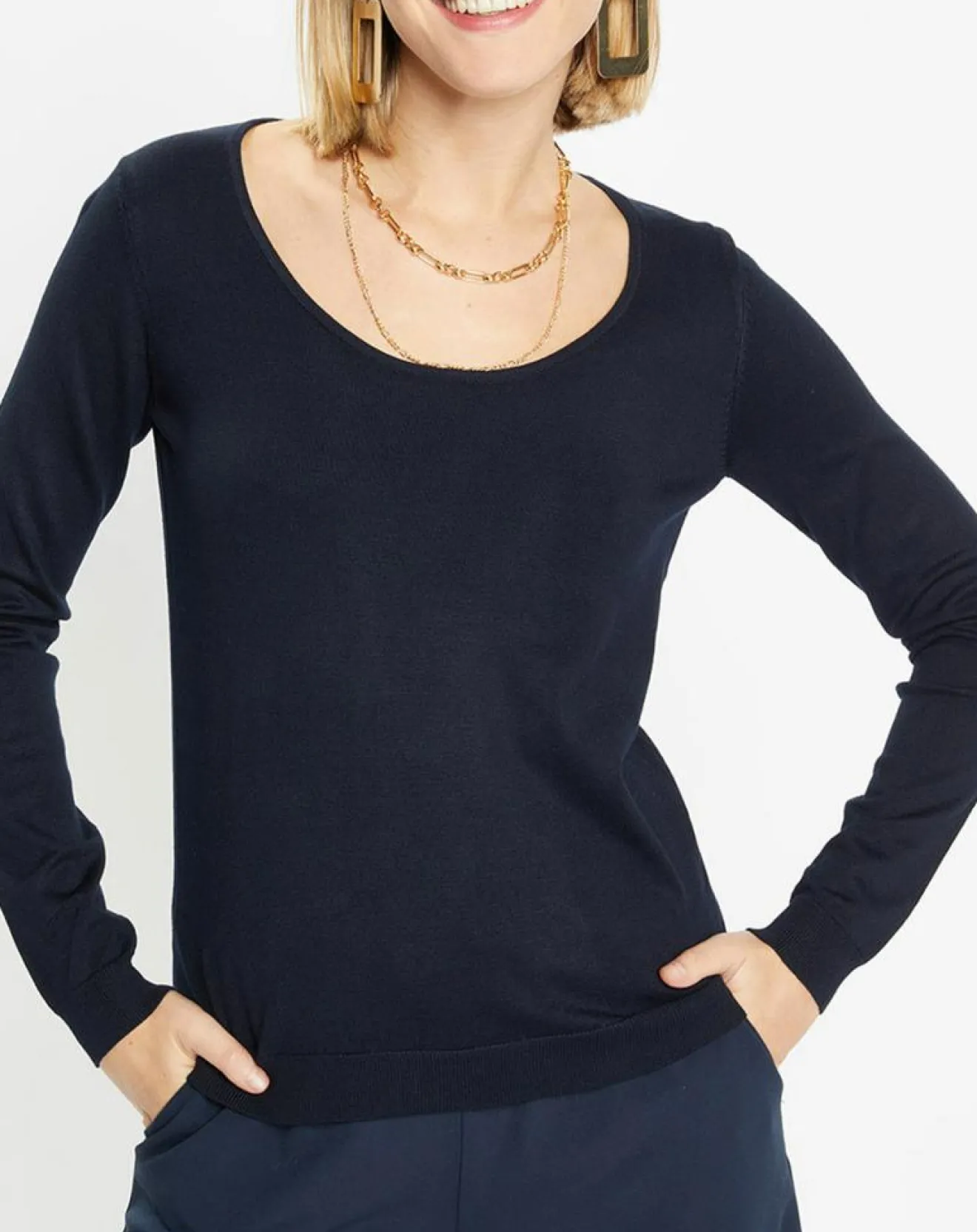 Ce pull droit en fine maille Galeries Lafayette est muni d’un grand col rond et de finitions côtelées.