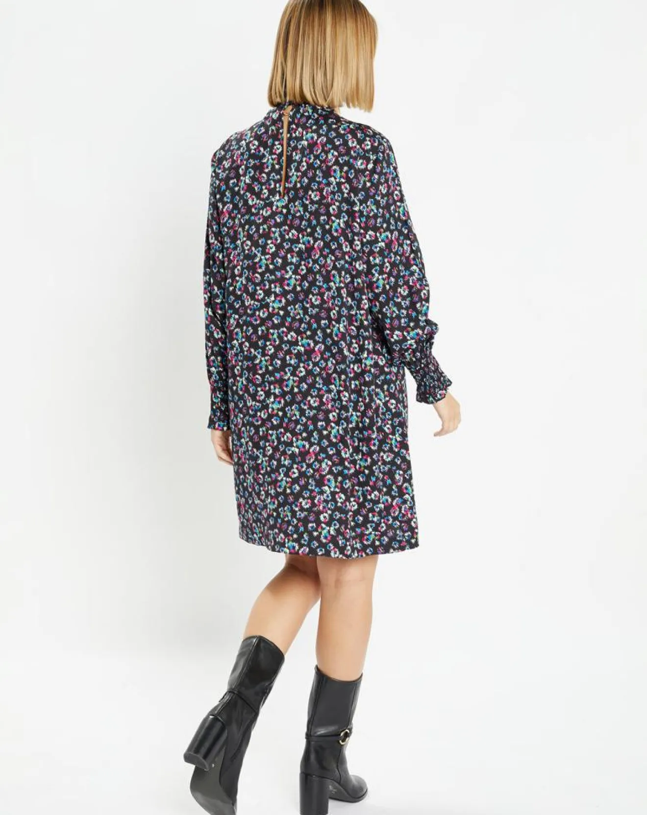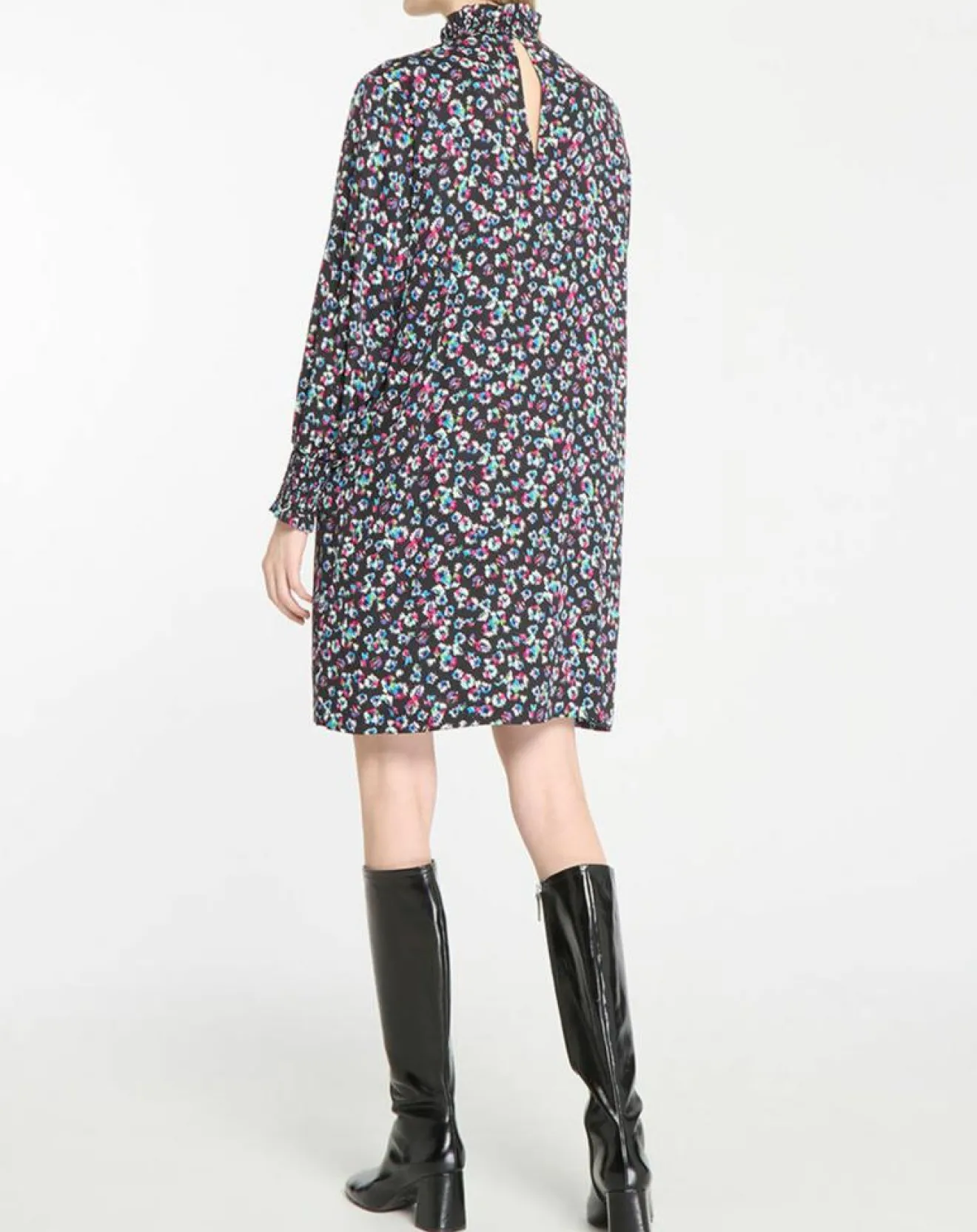 Cette robe courte et droite Galeries Lafayette est munie d’un imprimé fantaisie, d’un col montant à smocks boutonné sur la nuque et rehaussant une fente goutte d’eau et de manches longues.