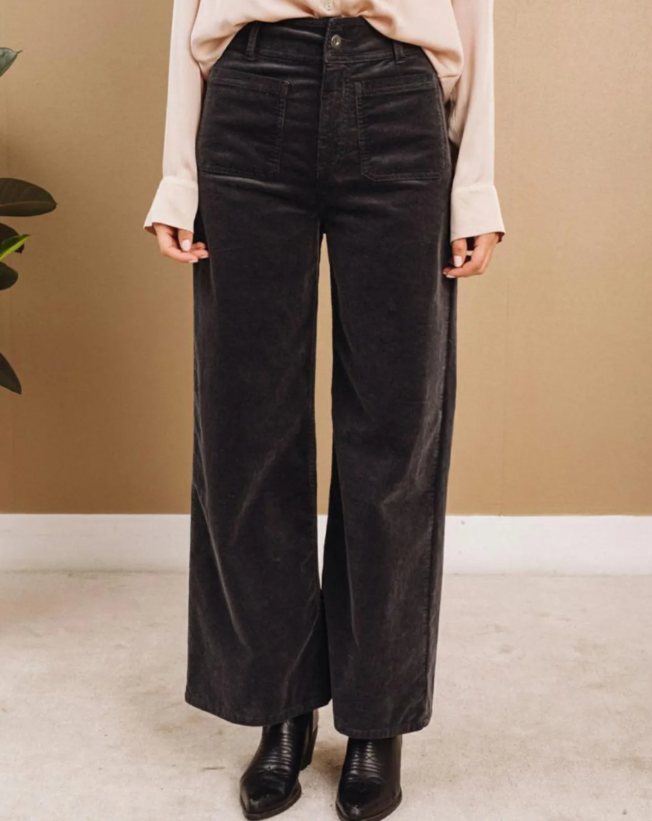 Pantalon taille haute jupe-culotte avec poches plaquées devant, zip et bouton métal