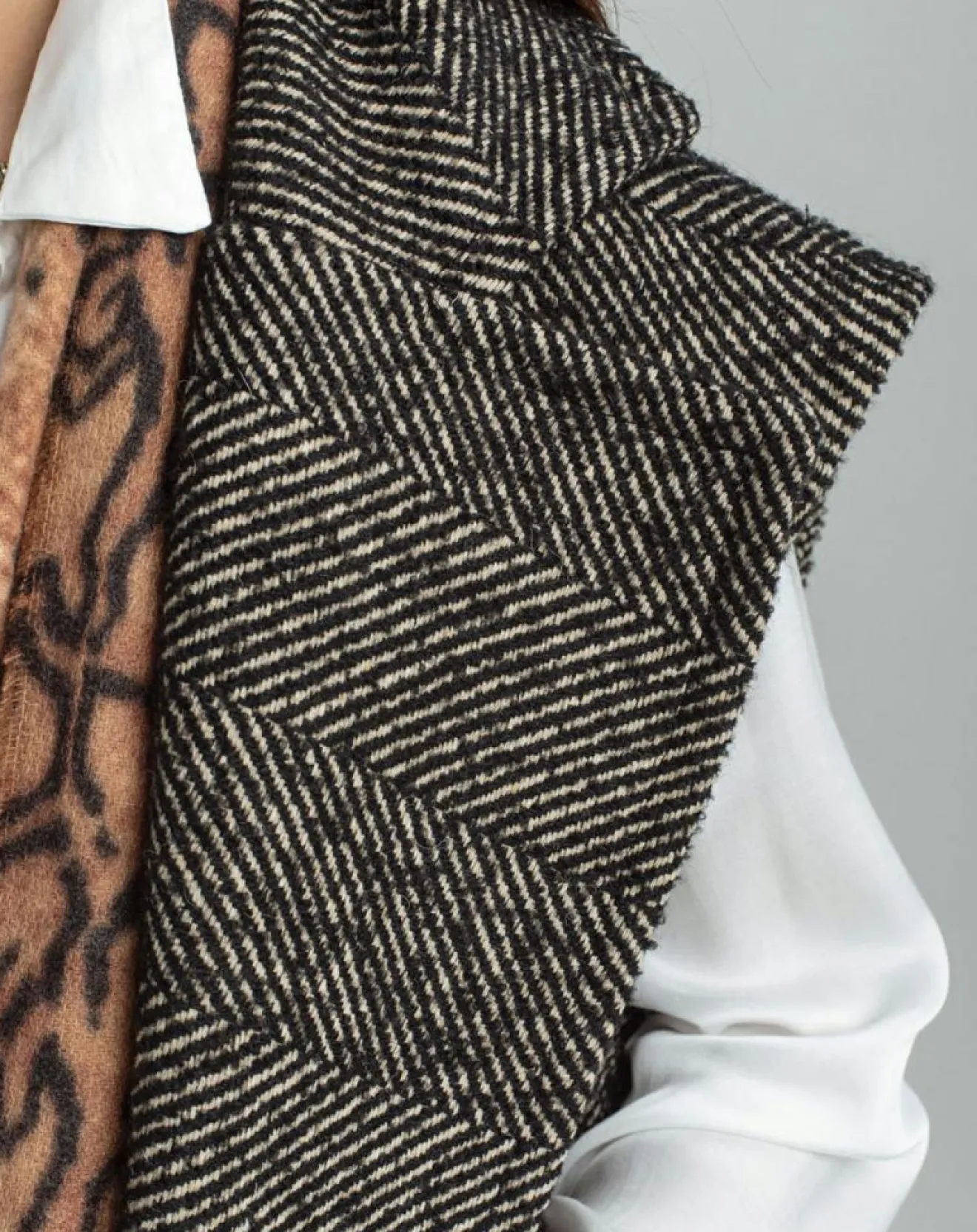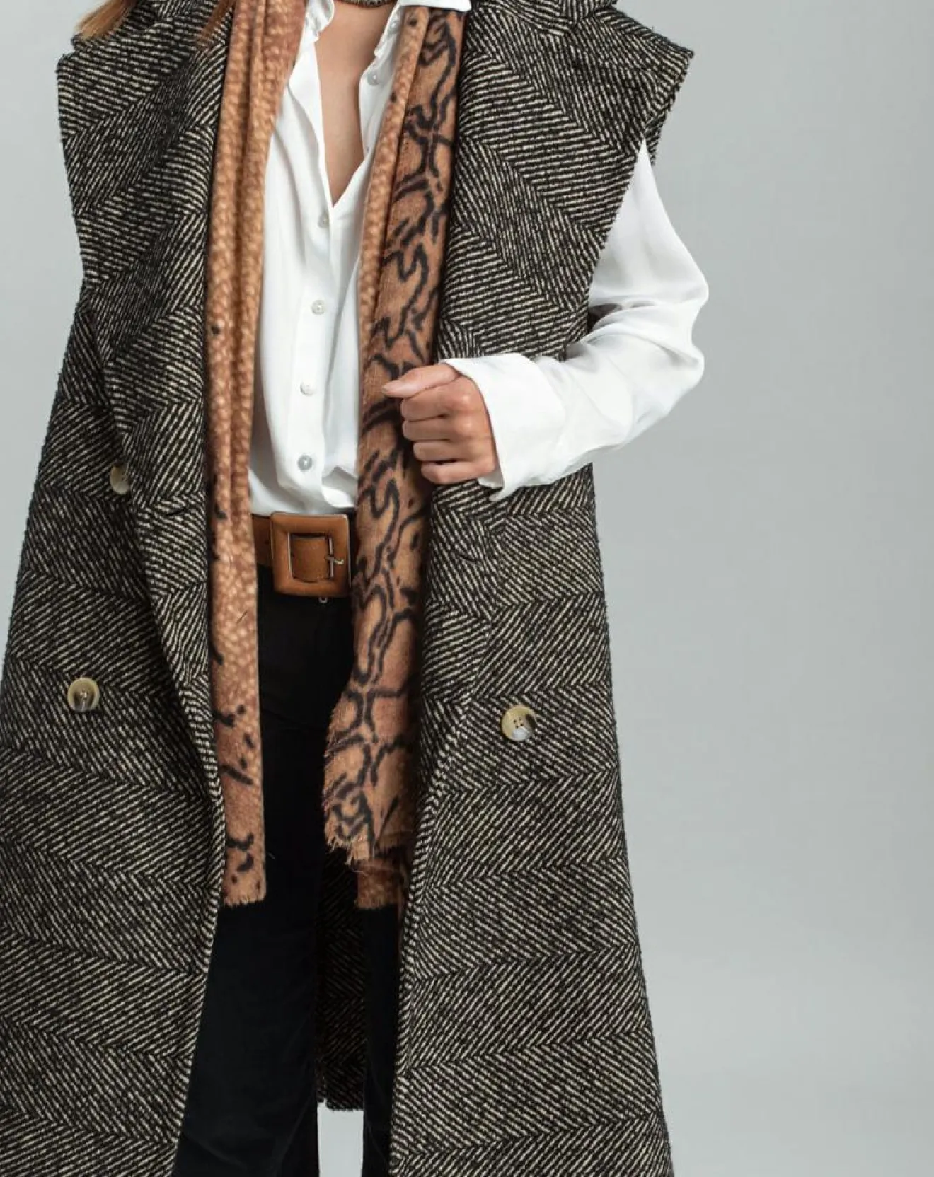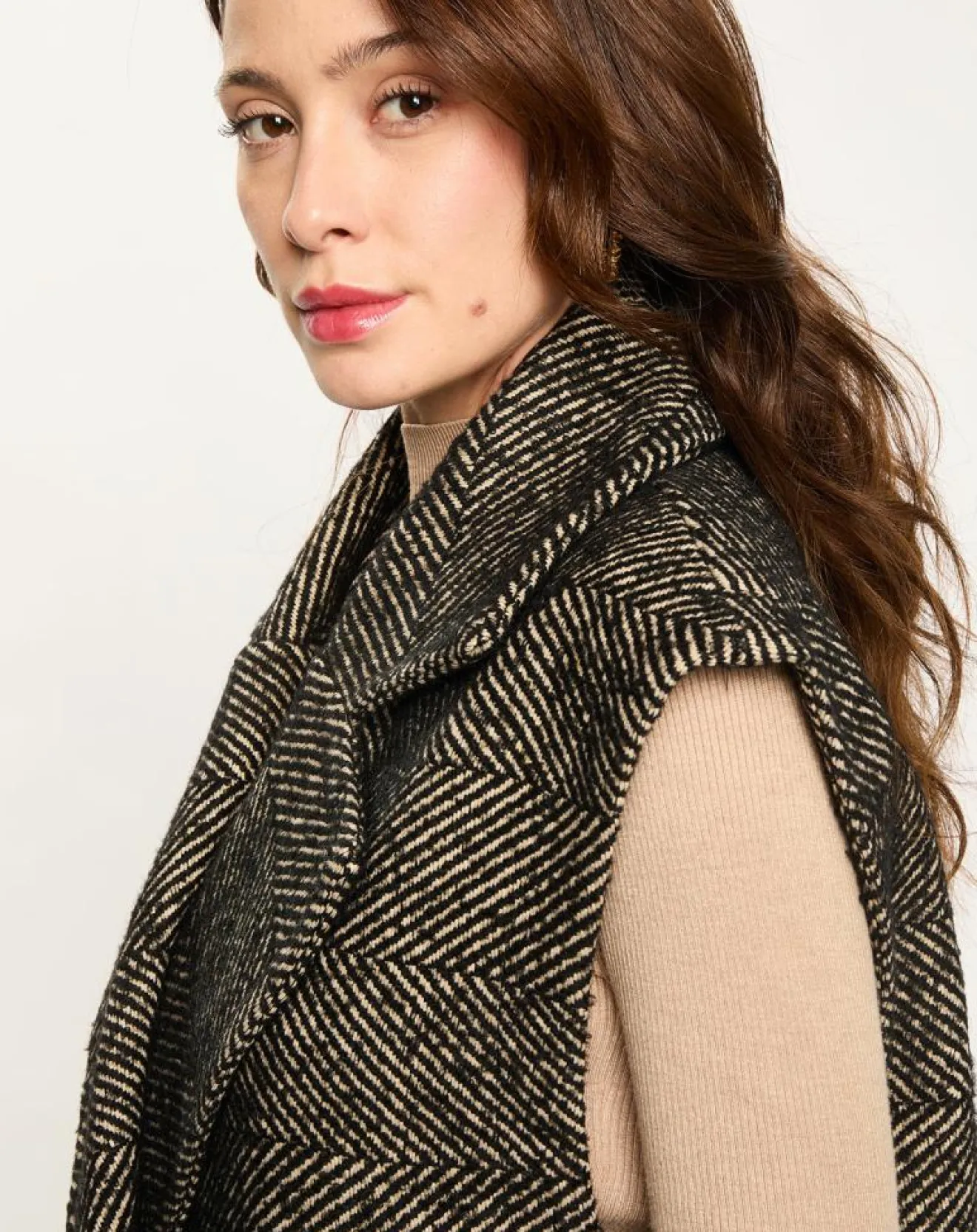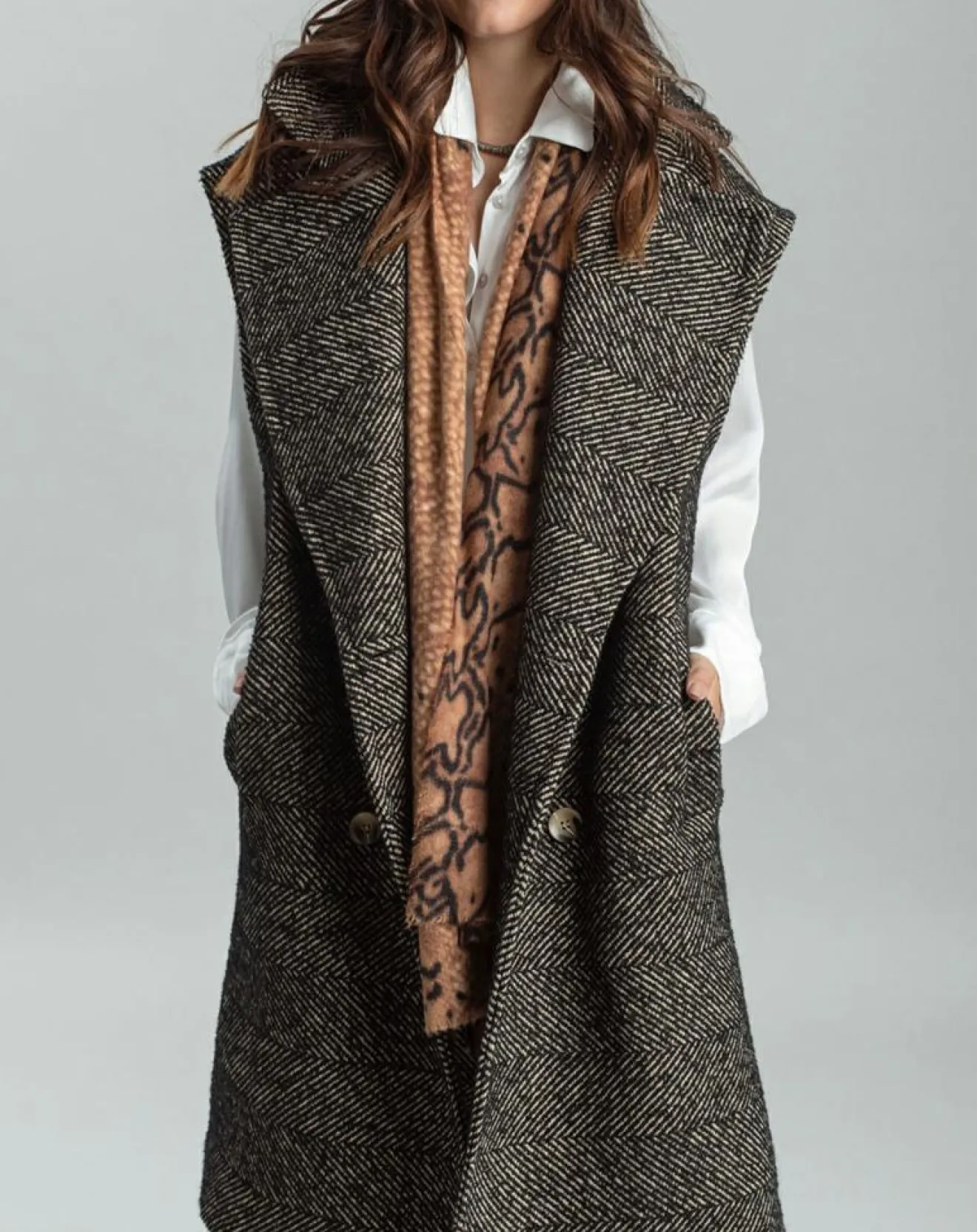Veste longue sans manches en chevron avec double boutonnage, avec col tailleur, assez droit