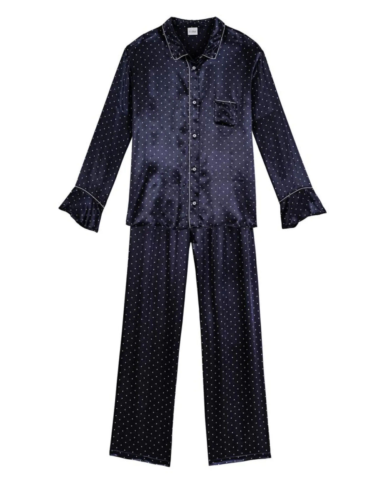 Le satin de viscose est imprimé d’un petit pois blanc discret. Une matière qui donne beaucoup d’allure.