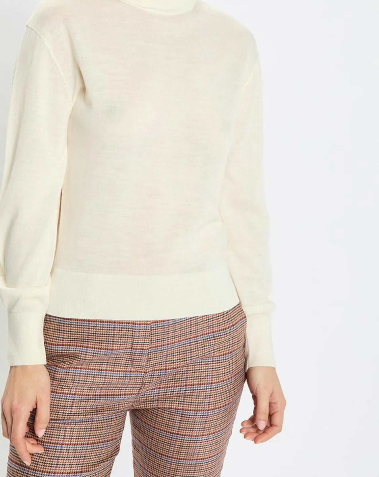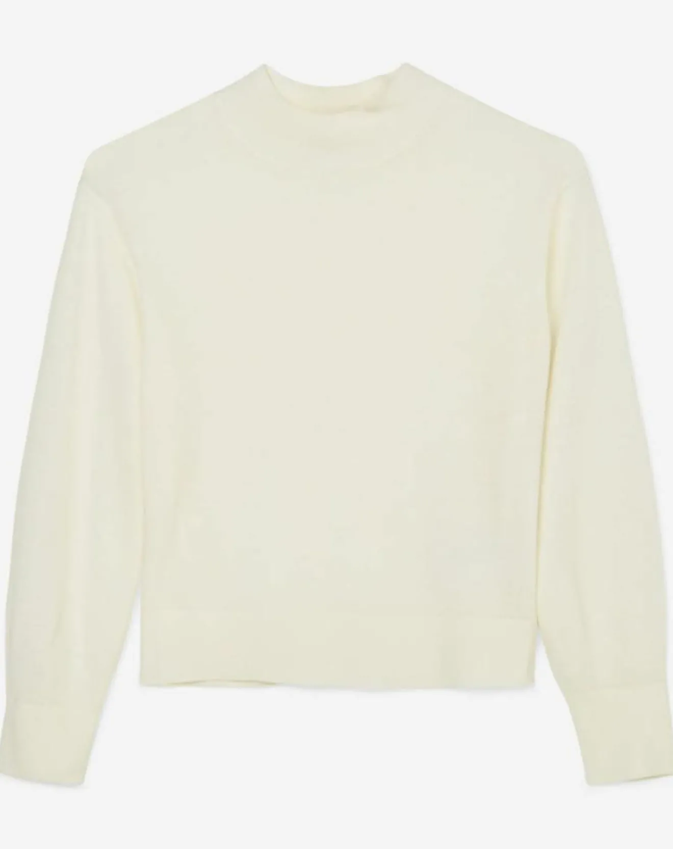 Cette pièce basique exclusive est dotée d’un col cheminée côtelé, d’épaules tombantes discrètes, de coutures inversées et de détails en tricot façonné le long de l’encolure.