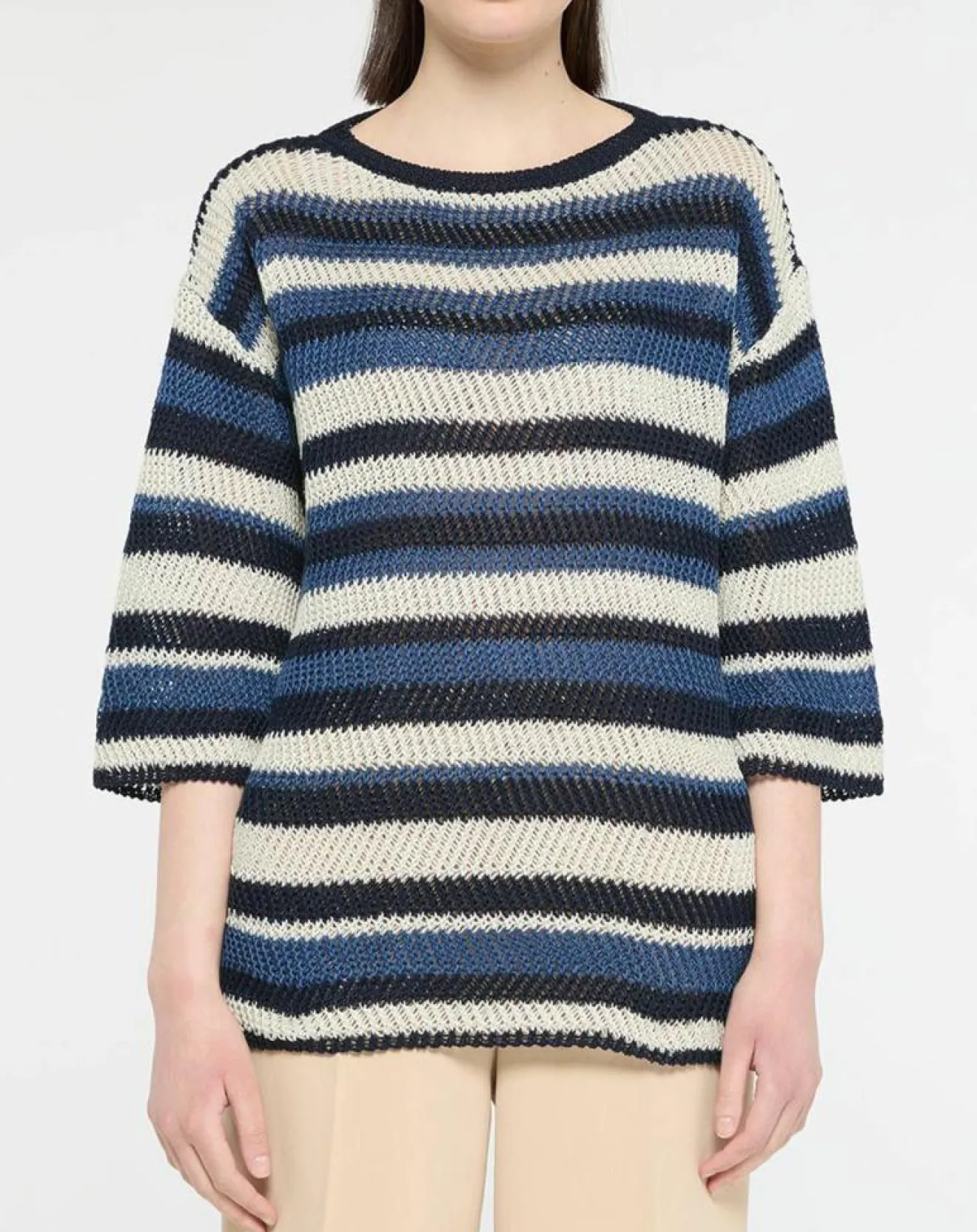 Ce pull droit ample Weekend Max Mara présente une maille en lin ajourée et rayée ainsi qu’un col rond évasé.