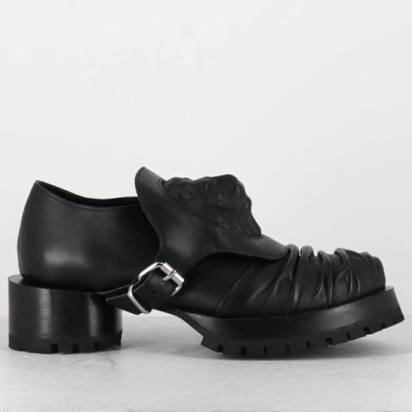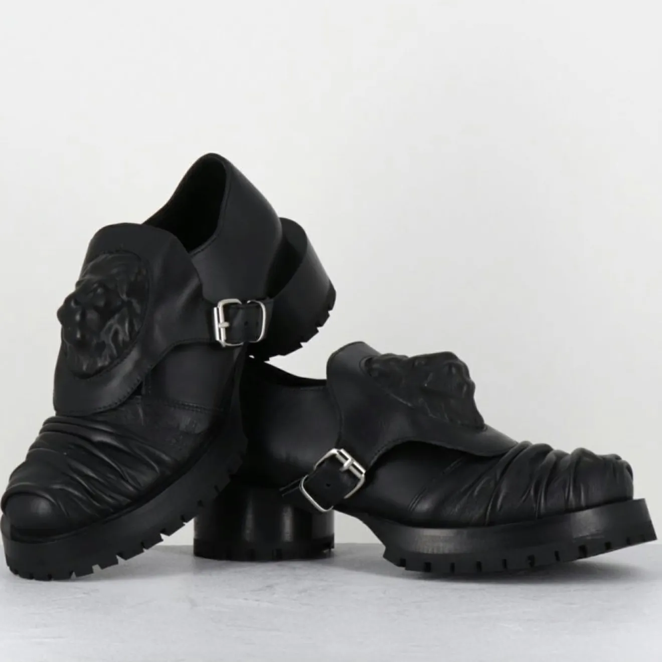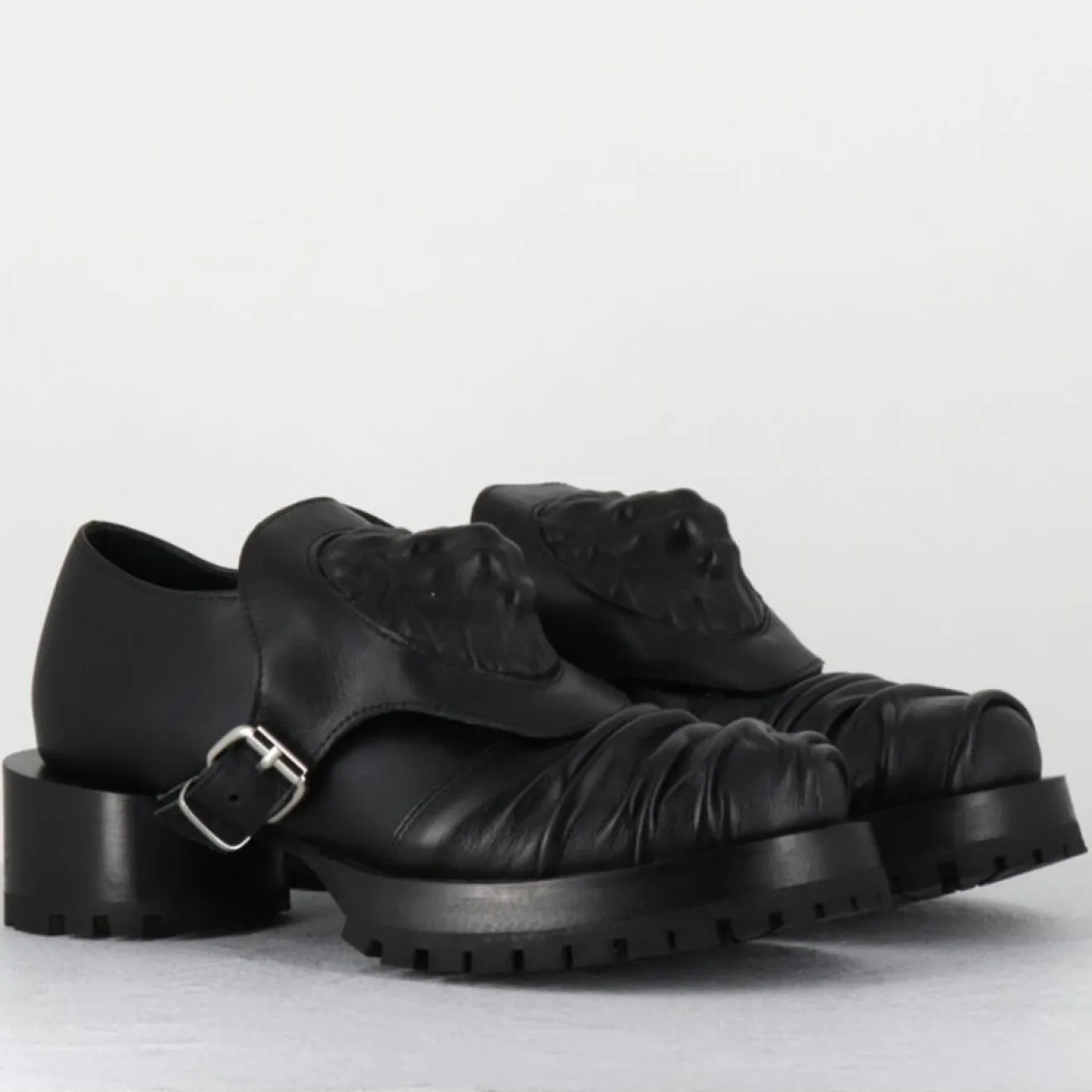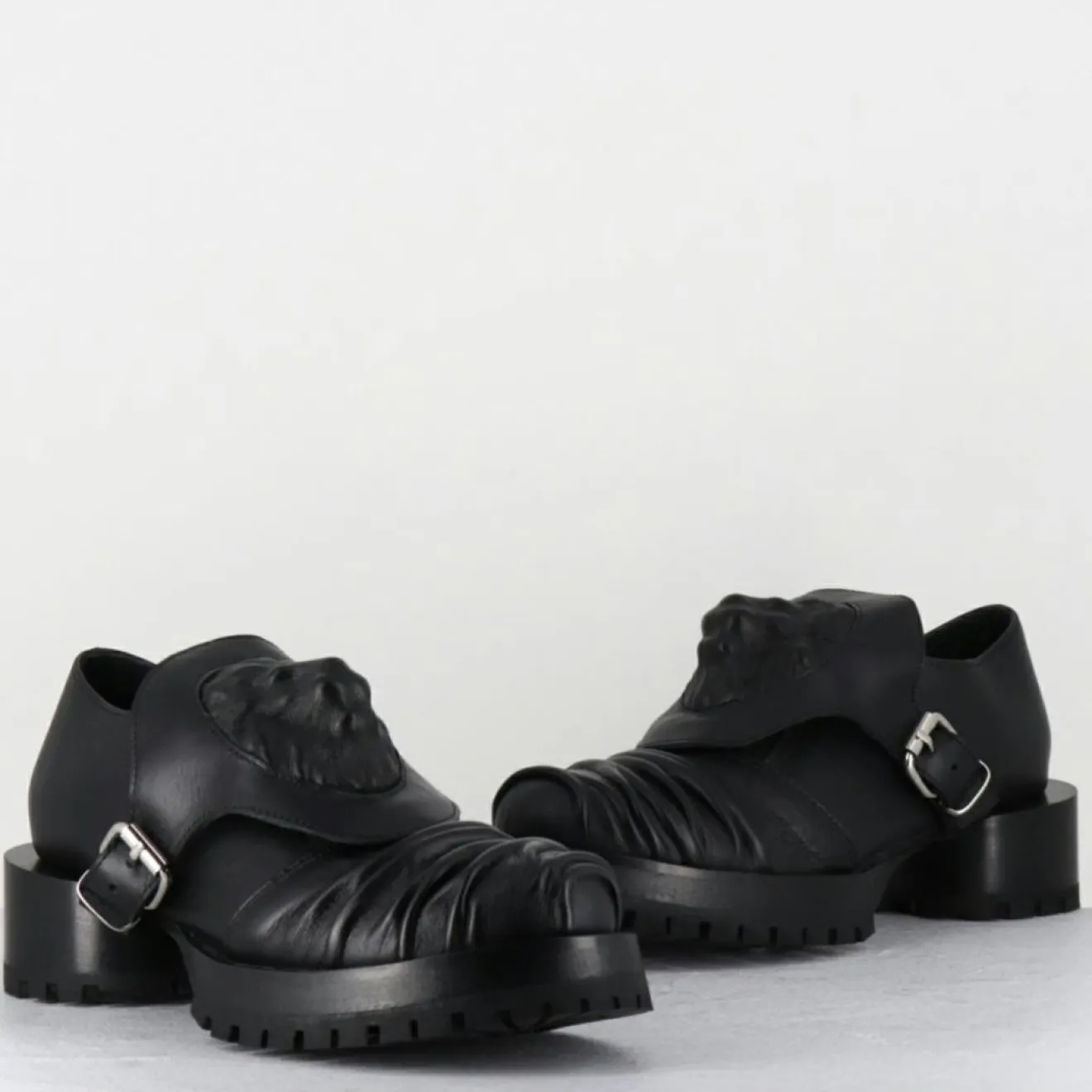 Chaussures derbies en cuir noir ornées d’un écusson à tête de lion esprit surréaliste qui se fixe à l’aide d’une petite boucle sur le côté