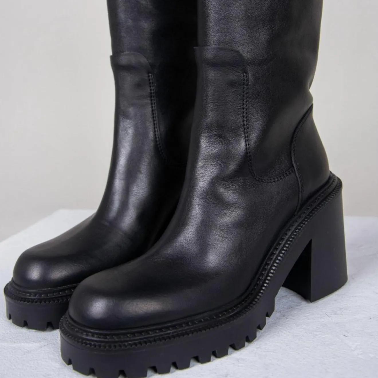 Bottes bikers en cuir noir, tige tubulaire souple, montées sur un talon largechunkyen gomme & semelle crantée.