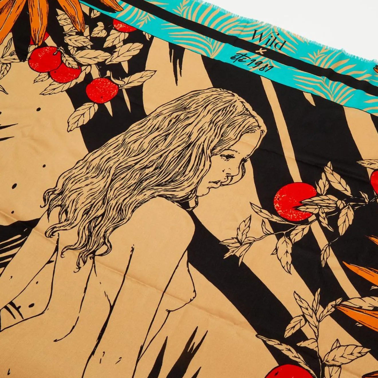 Ici est présentée une femme se déshabillant dans un jardin tropical décoré de délicieuses oranges