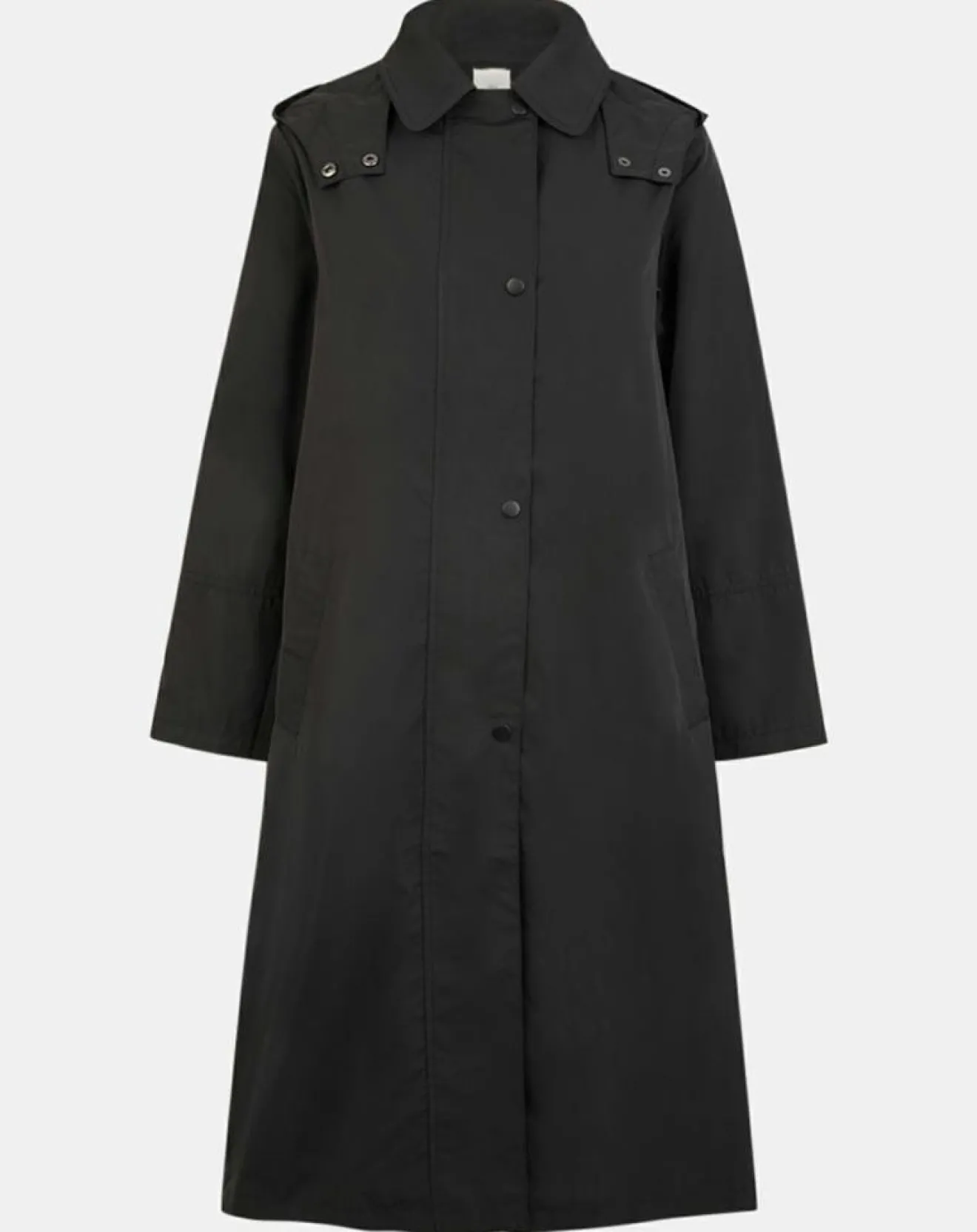 Cet imperméable longueur genoux Yerse est muni d’une capuche, d’une fermeture zippée dissimulée sous patte à boutons pression et de poches.