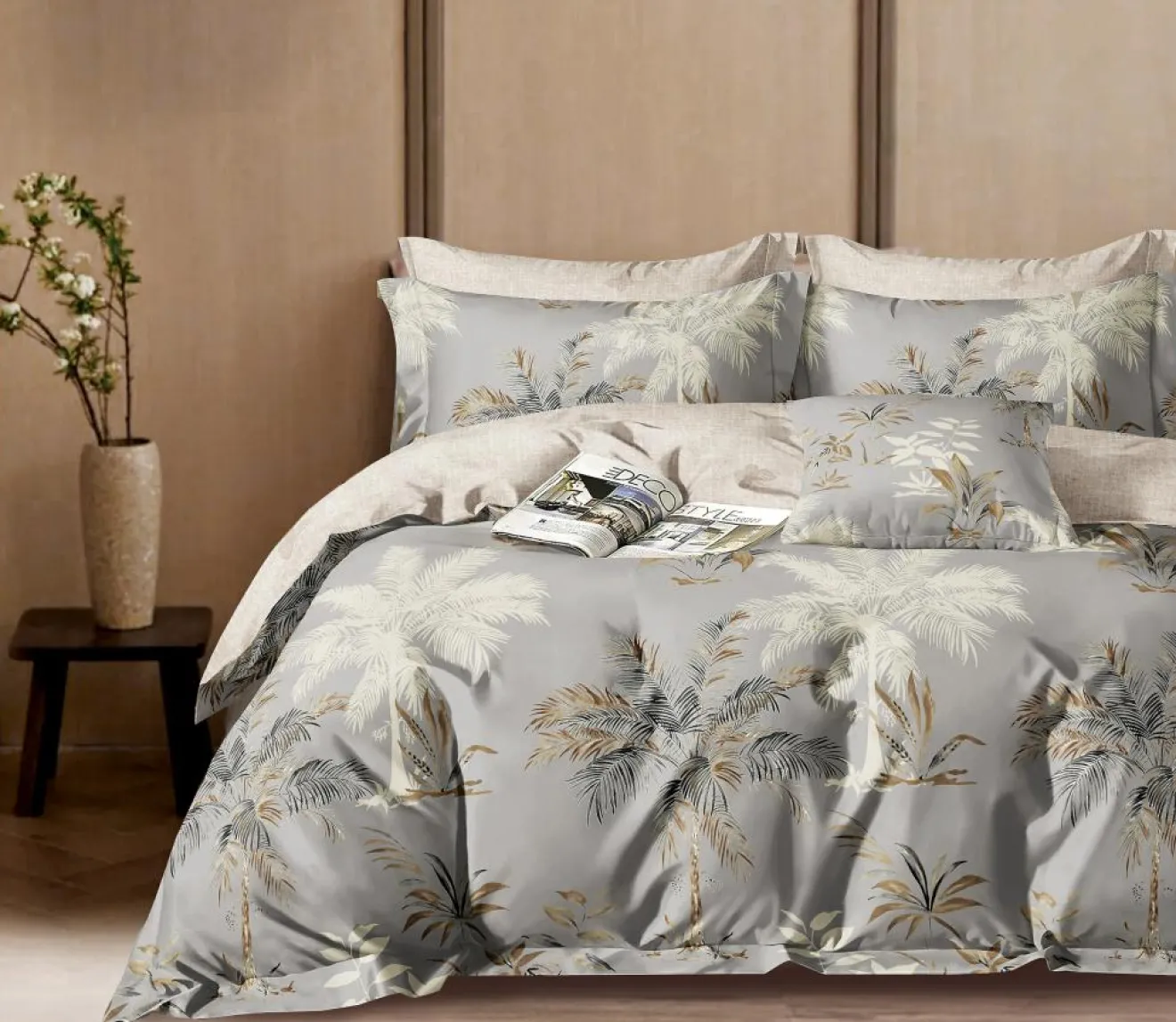 Plongez dans une ambiance apaisante et élégante avec la parure Sélénore, qui revisite le thème tropical dans une version douce, moderne et raffinée. Les palmes finement illustrées se déclinent en nuances sable, crème et anthracite sur un fond gris perle, offrant un rendu harmonieux et très chic.