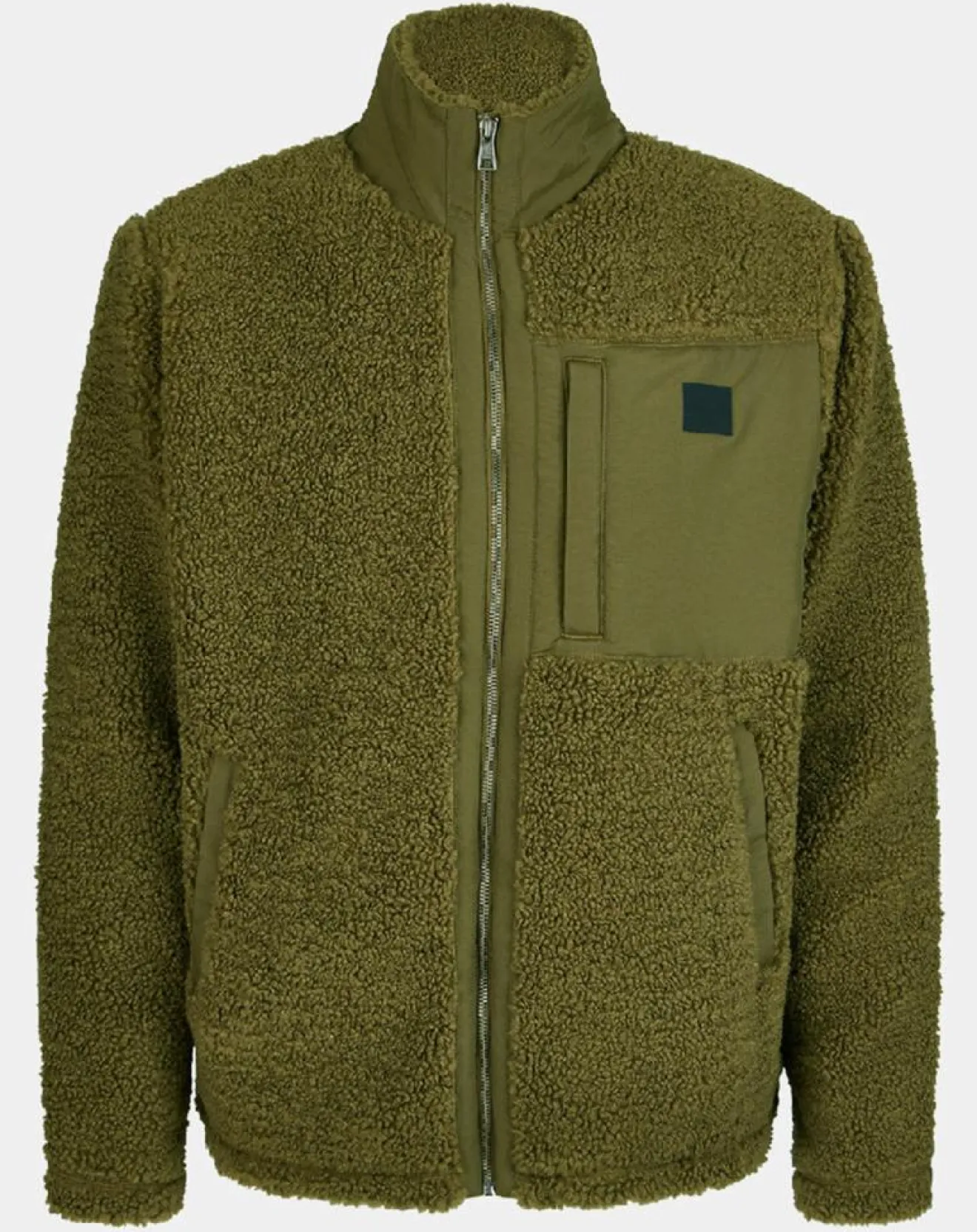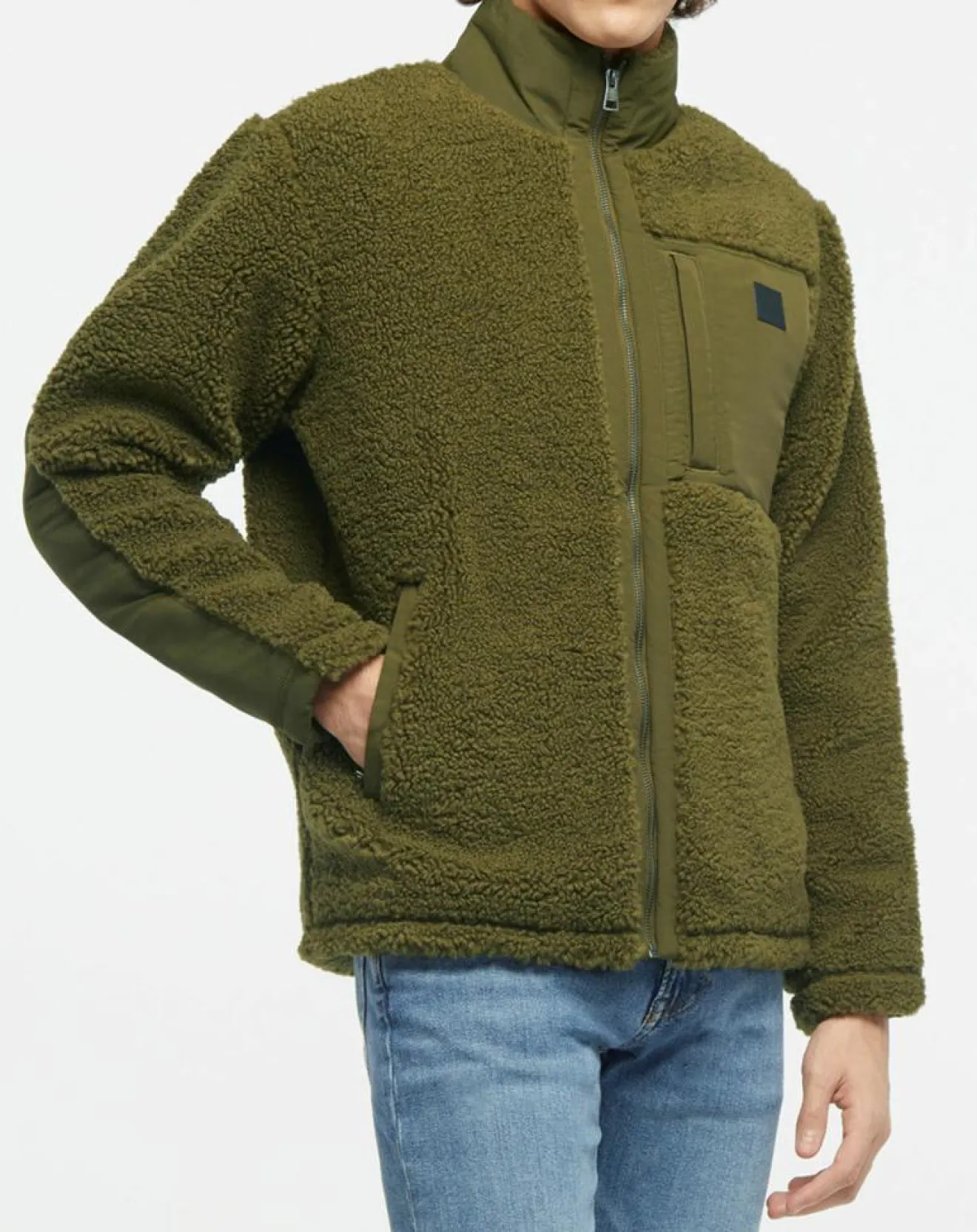 Cette veste droite Gant bi matière, façon peau lainée et tissu lisse, présente un col montant, une fermeture à glissière et 3 poches zippées.