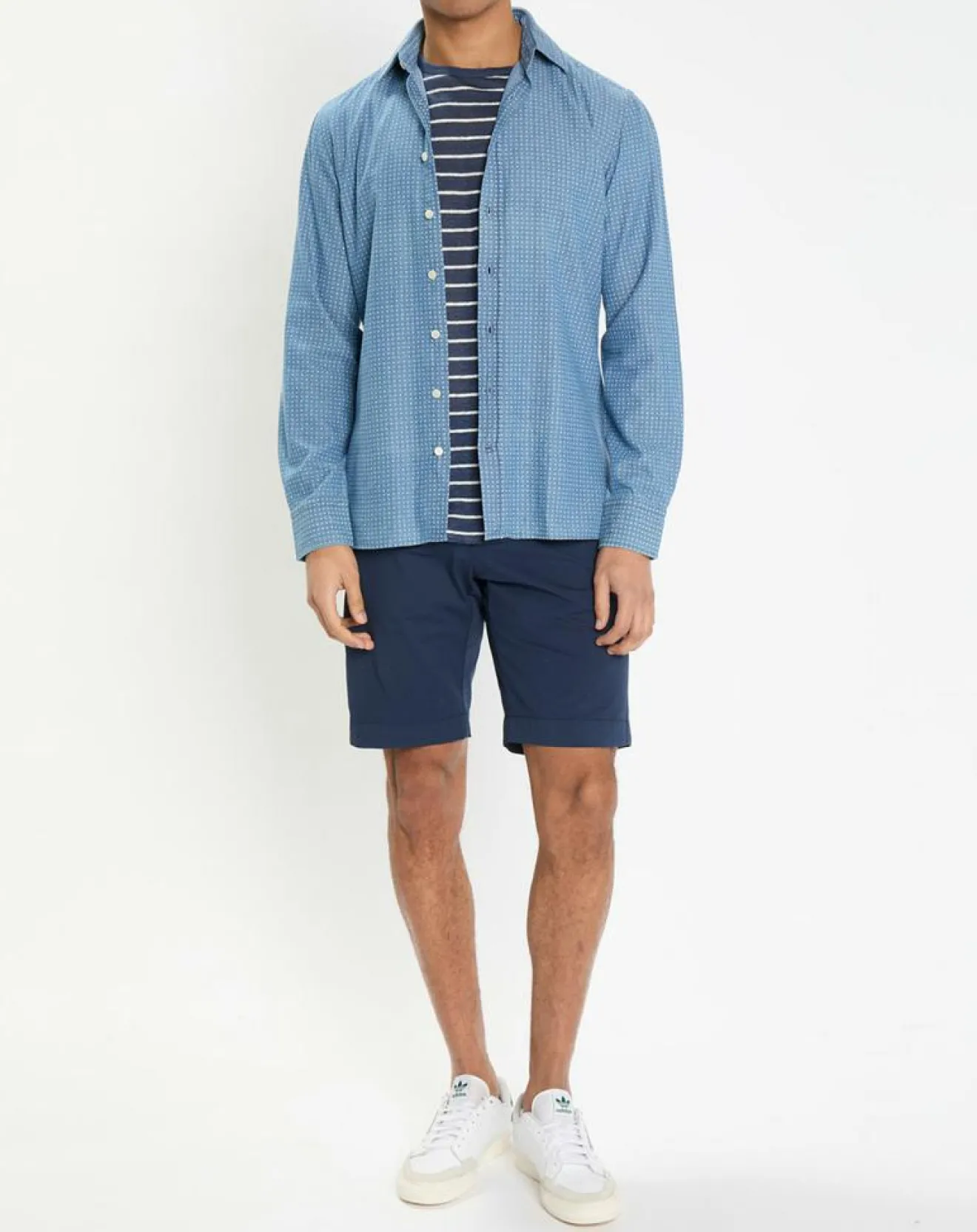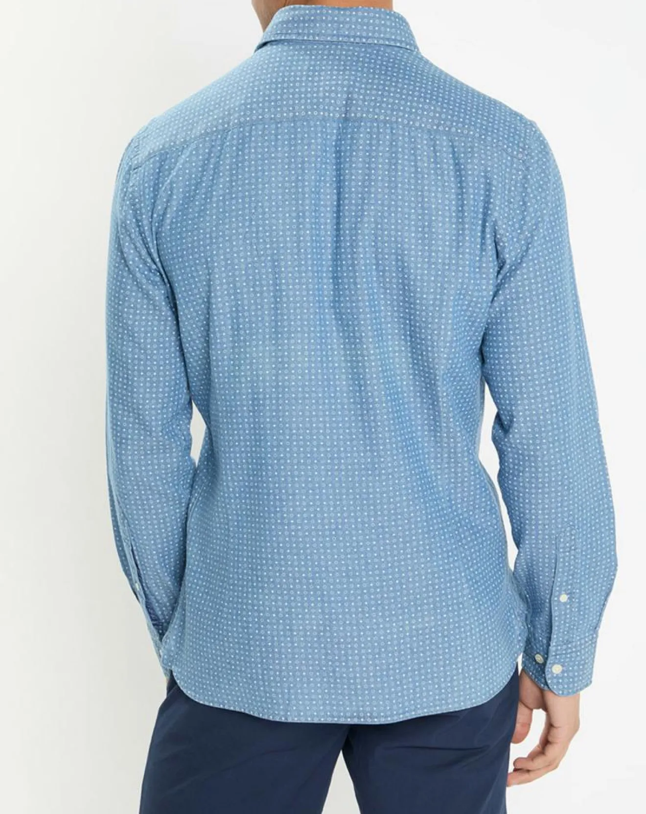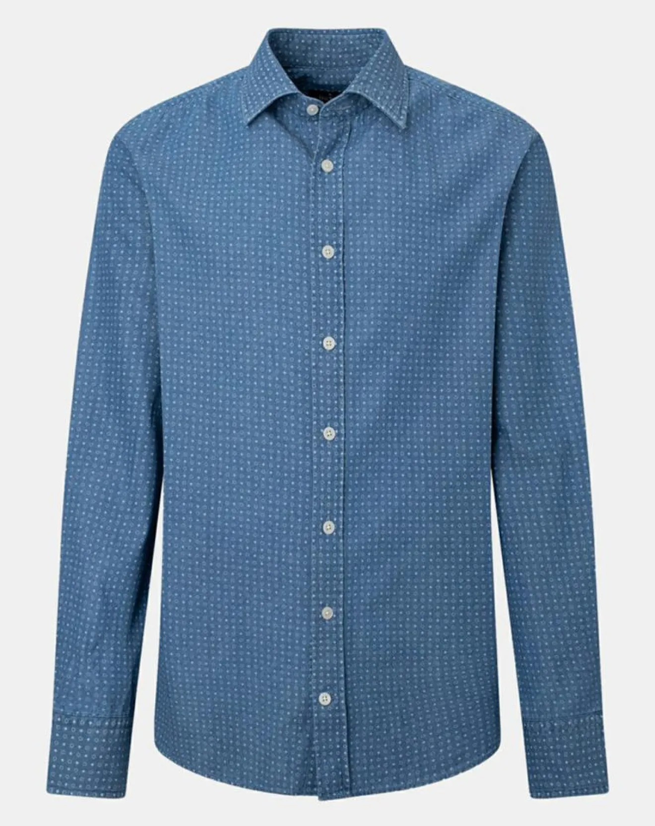 Cette chemise ajustée Hackett London en coton denim à imprimé motif géométrique all-over, est munie d’un col italien, de manches longues, de poignets ronds à 1 bouton ajustable, d’une fermeture boutonnée et d’une base arrondie