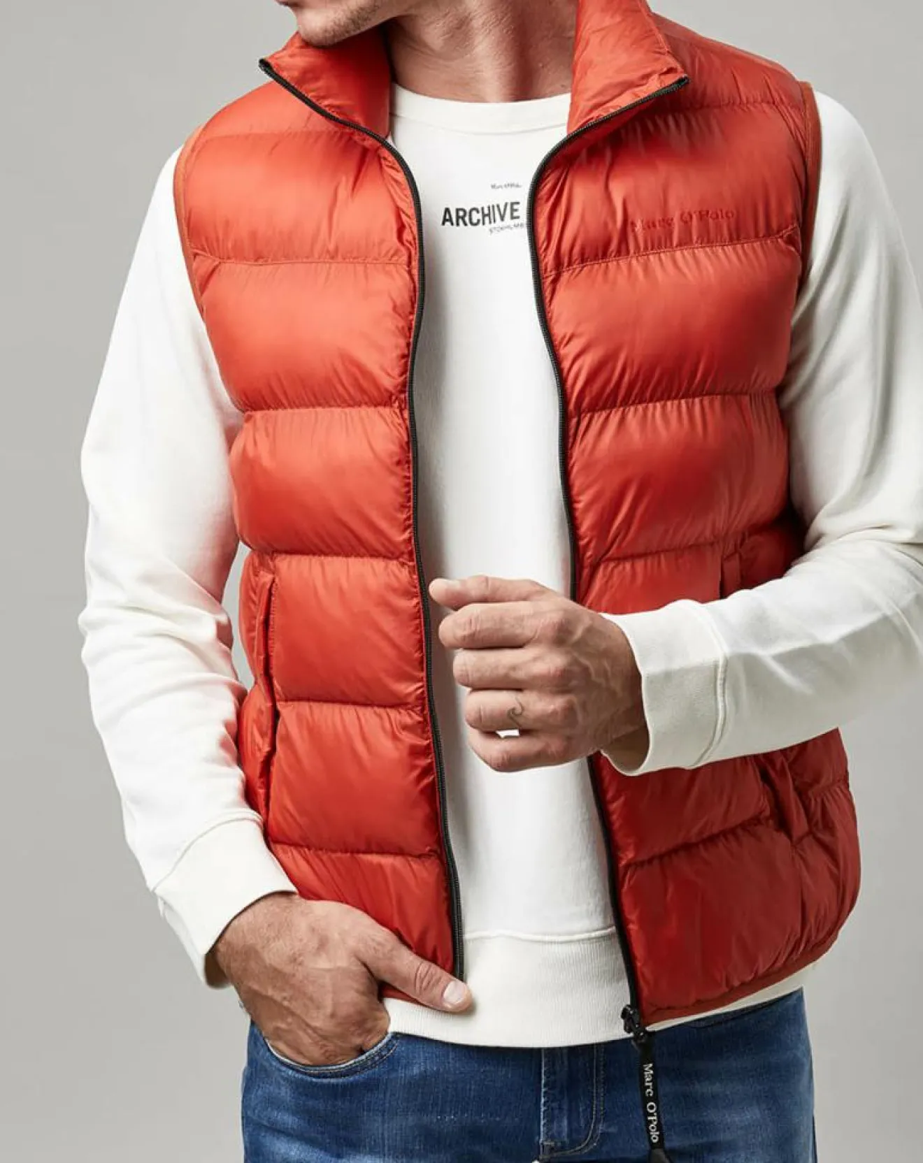 Gilet matelassé ultra-léger, à la surface en nylon hydrofuge, à col droit et zip facile d’utilisation.