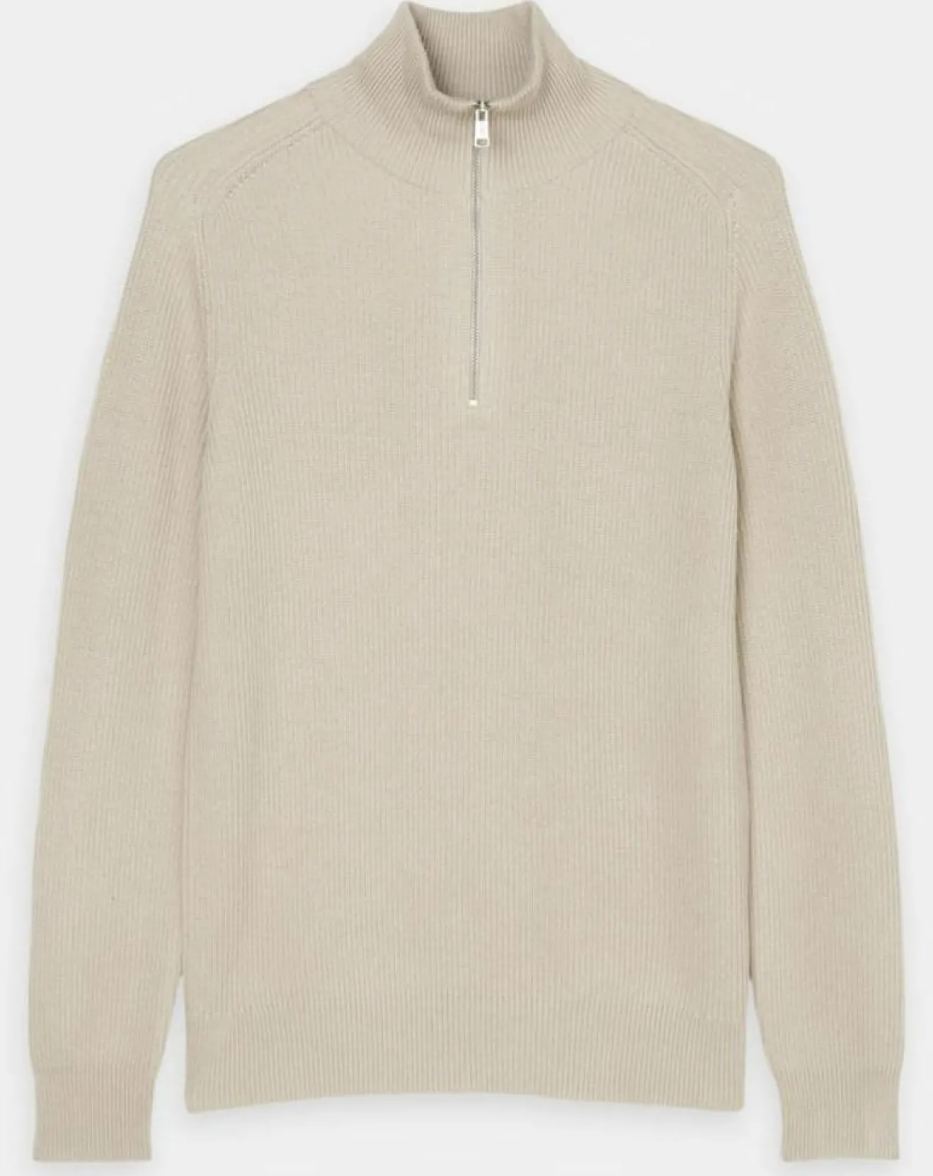 Dans un design en maille côtelée élastique, il arbore une coupe Regular Fit dotée d’un col montant, d’épaules raglan et d’une fermeture à demi-zip nervuré.