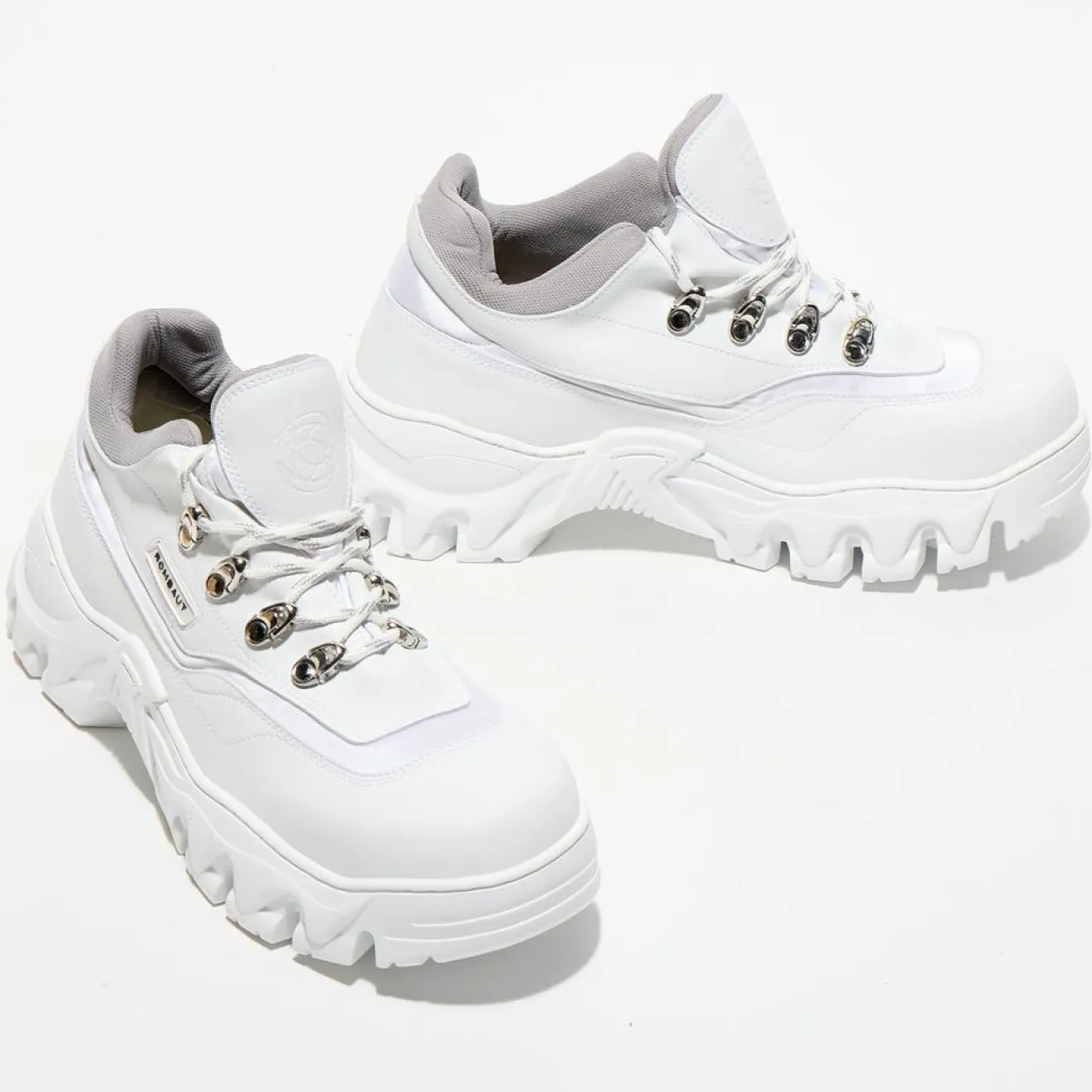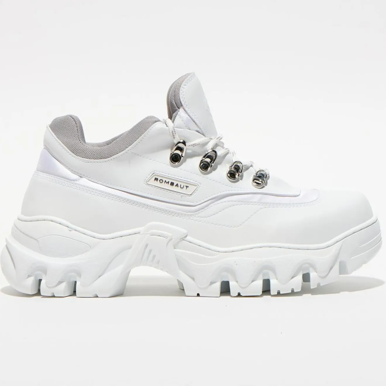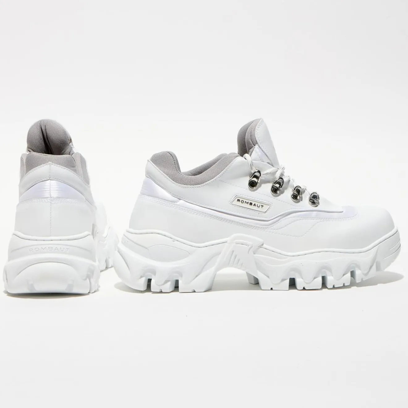 Ces baskets basses Rombaut présentent un bout rond, un laçage à 7 oeillets, une languette siglée ton sur ton, des empiècements superposés et la griffe piquée sur les côtés