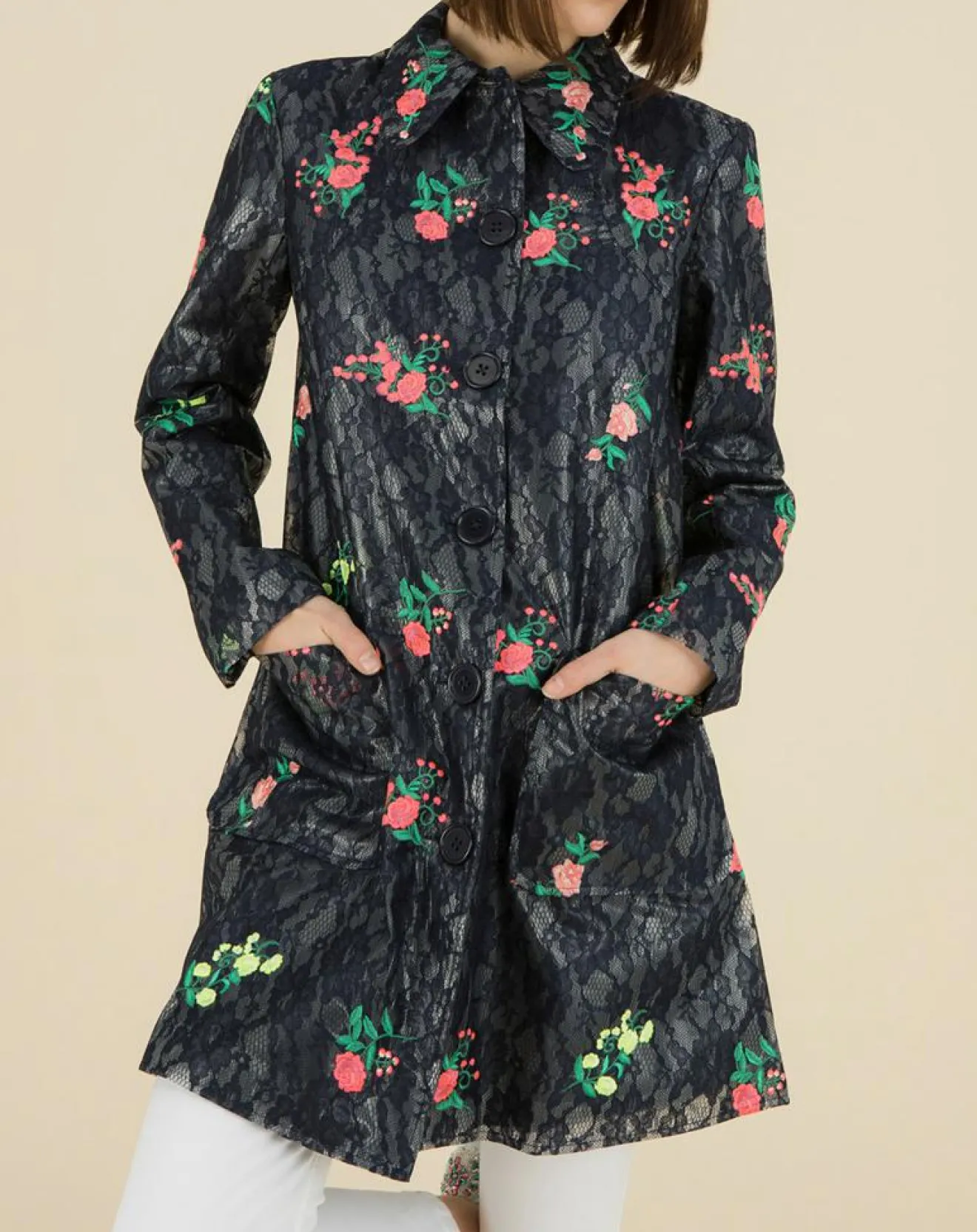Broderies florales et dentelle sur l’ensemble