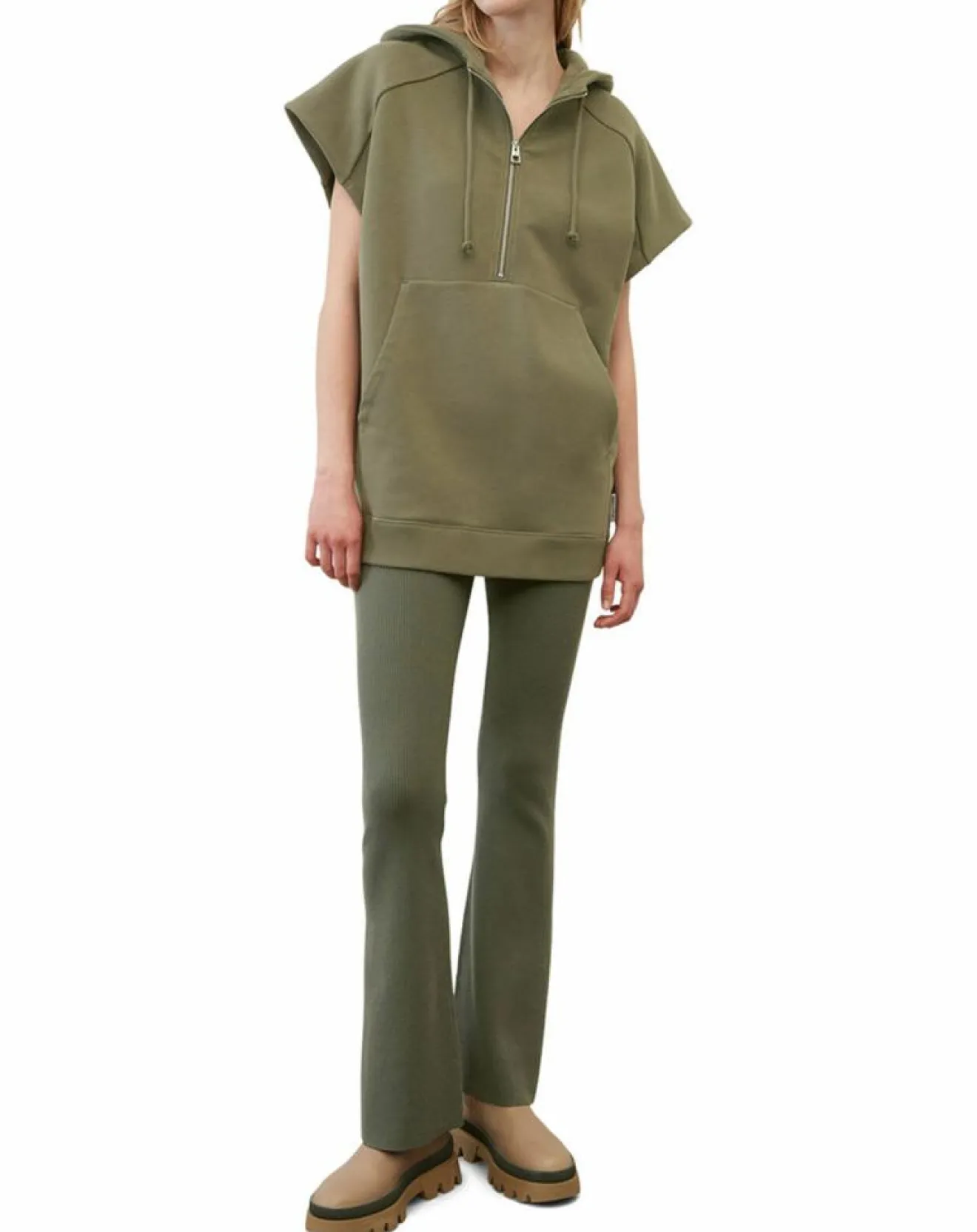 Le sweat à capuche zippé sans manches, de style cape, se superpose ou se porte en solo à même la peau, de manière décontractée.