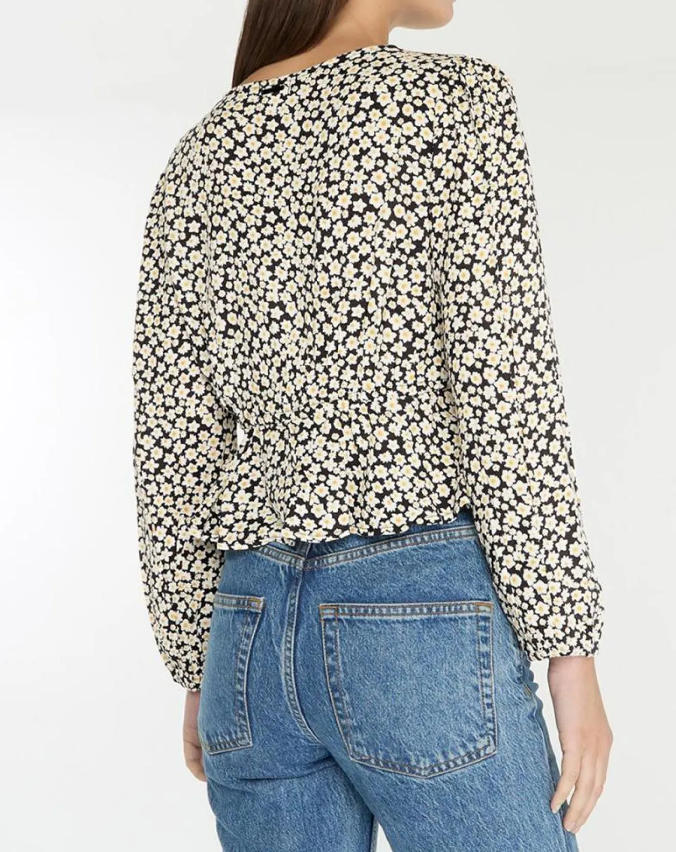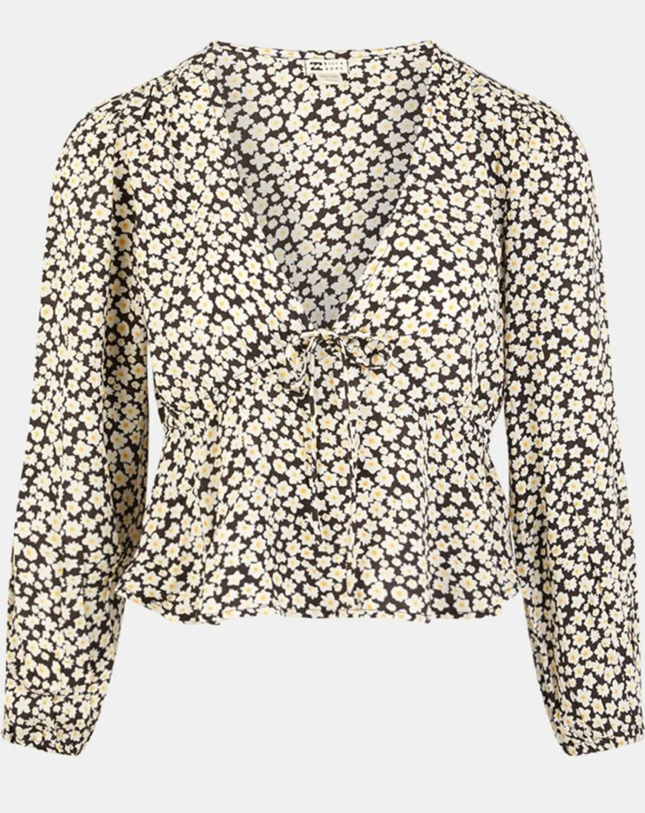 Ce top court Billabong présente un imprimé daisy all-over, une encolure en V, des manches longues ainsi qu’un lien à nouer sous poitrine