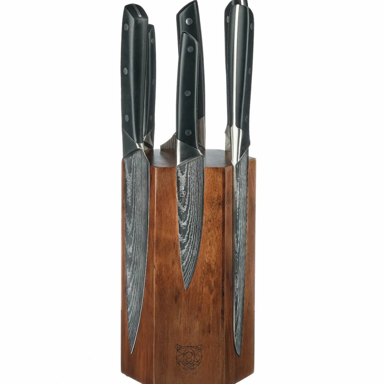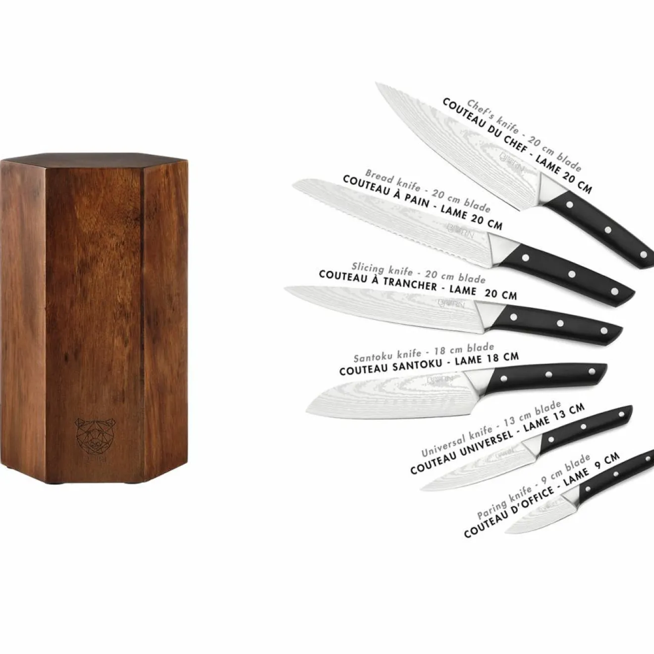 – Fabriqué en acier inoxydable finition satinée effet damas et poignée ABS (couteaux) – bois d’acacia (bloc)