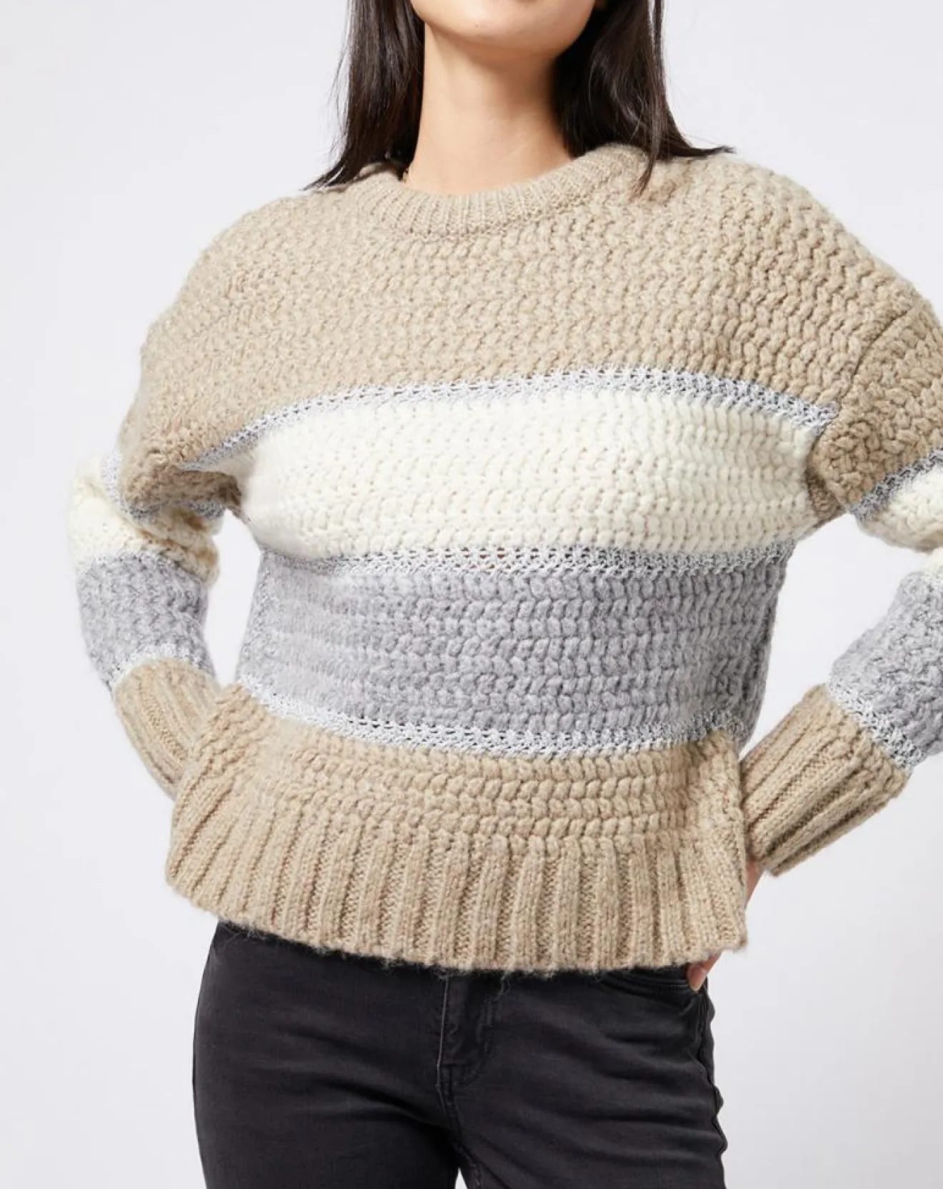 Tricot grosse maille fantaisie, alterné par des rayures en fils lurex