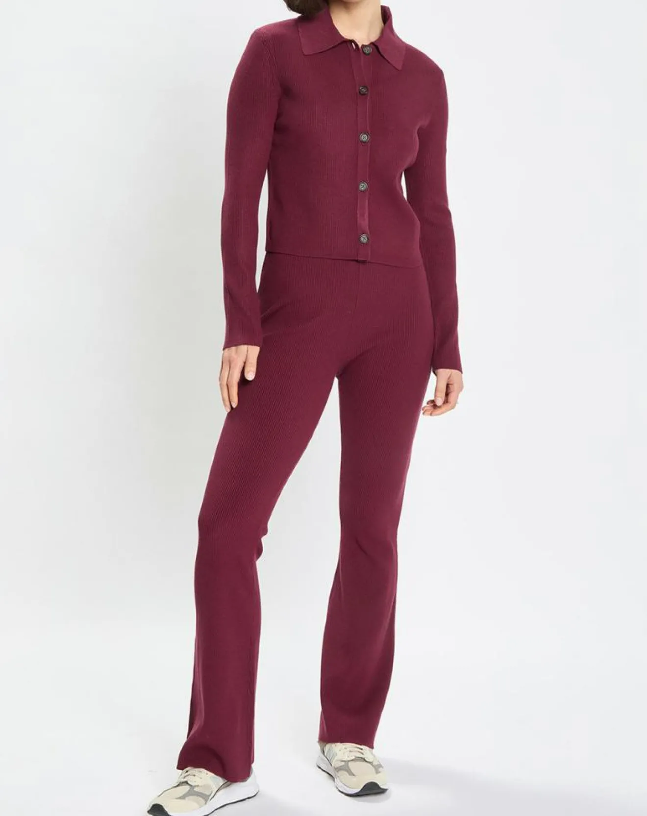 Réalisé en viscose mélangée compacte et finement côtelée, il se marie très bien au pantalon en maille évasé et décontracté.