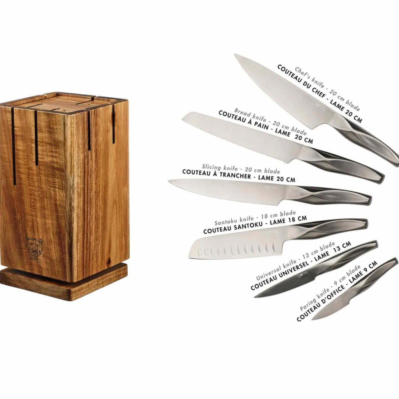 – Contient 1 couteau d’office (lame 9cm) + 1 couteau universel (lame 13cm) + 1 couteau Santoku (lame 17cm) + couteau à trancher (lame 20cm) + 1 couteau à pain (lame 20cm) + 1 couteau chef (lame 20cm) + 1 bloc couteaux rotatif