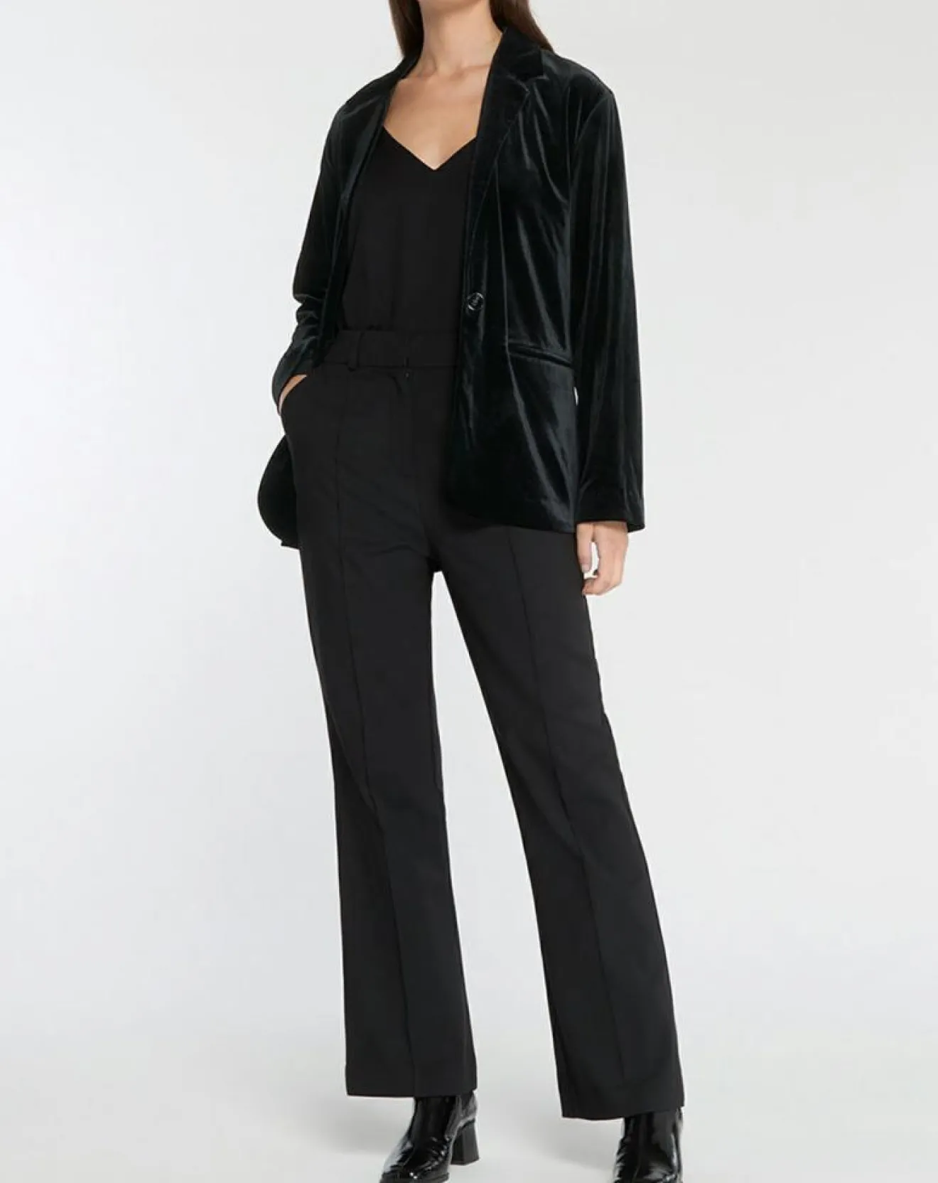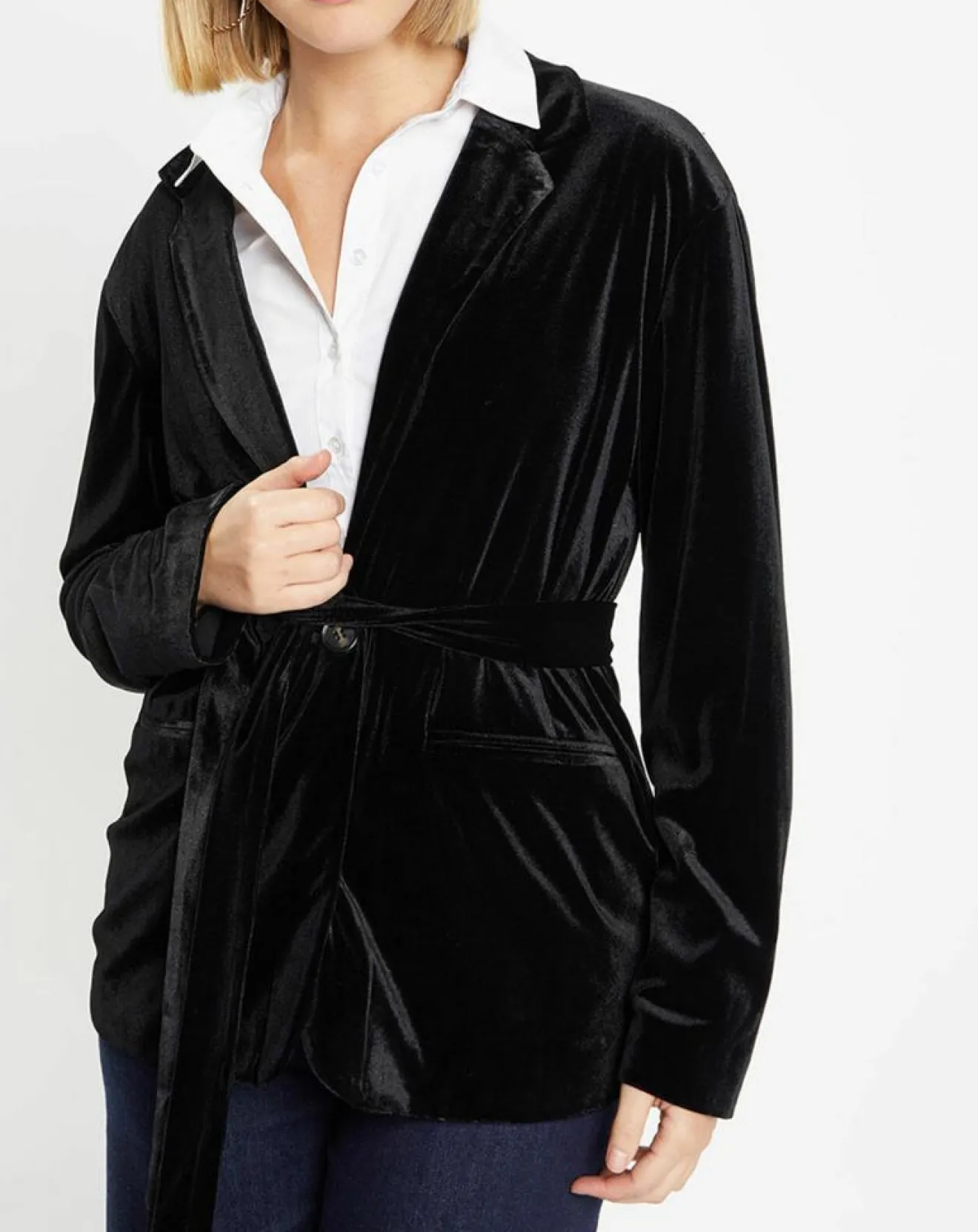Ce blazer Galeries Lafayette en velours lisse est munie d’un col tailleur, d’un fermeture 1 bouton et de poches.