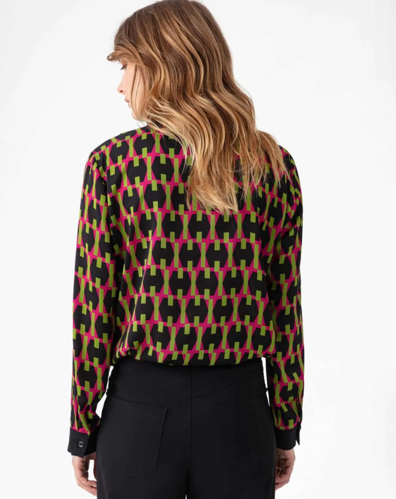 Le tissu satiné arbore un motif géométrique vert et fuchsia qui apporte une touche d’élégance moderne, tandis que le jersey technique noir sur le col, les manches et le boutonnage confèrent une allure sportive