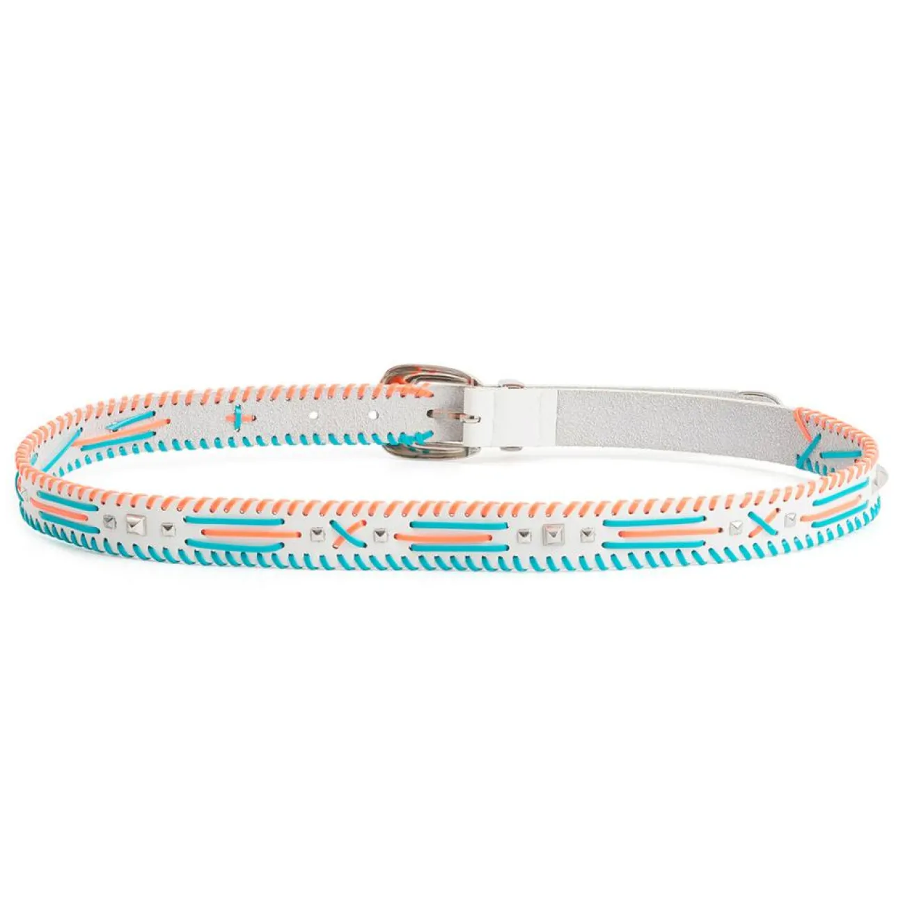 Ceinture en cuir véritable rebrodée de larges fils scoubidou contrastés