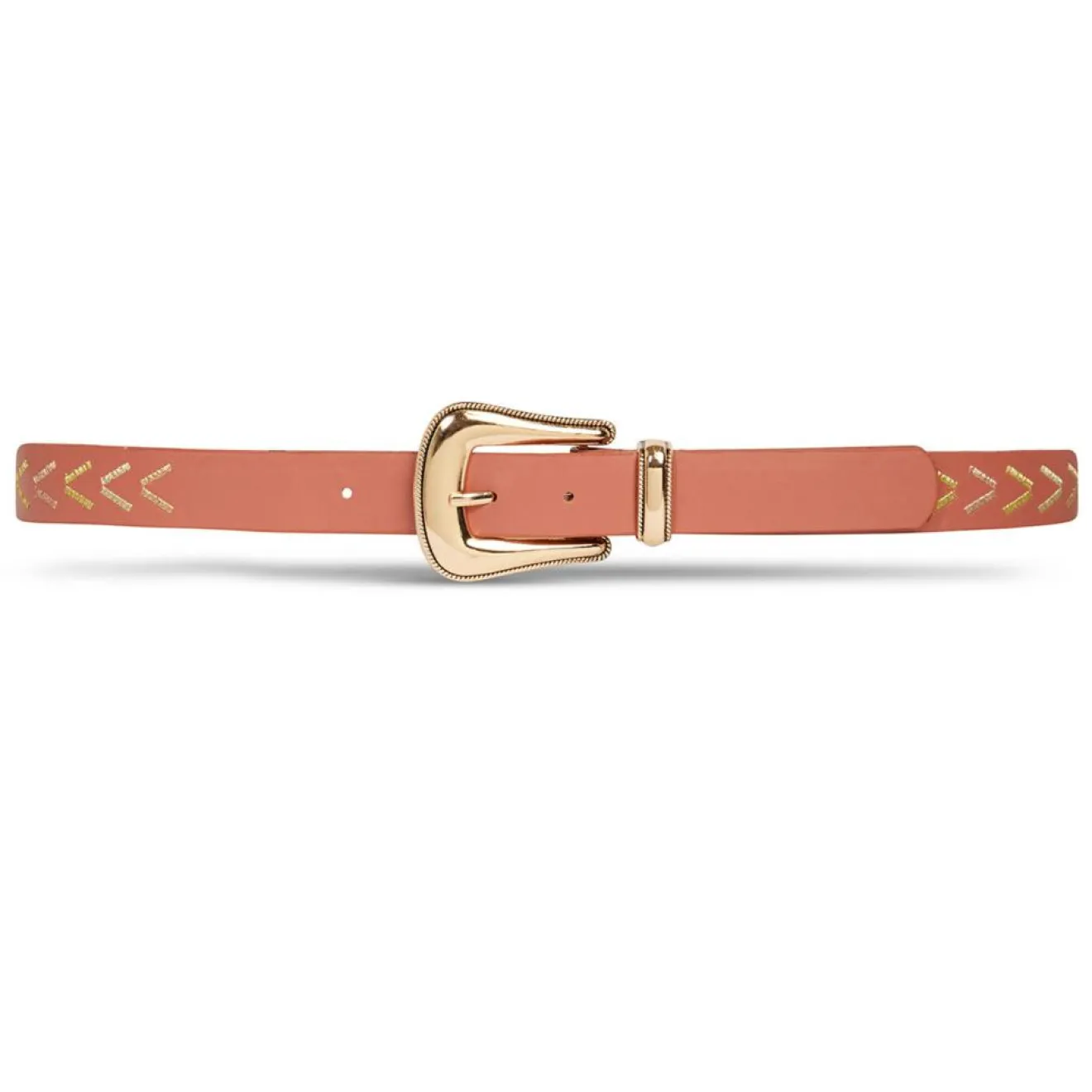 Ceinture en cuir rose, brodée de fils colorés dans les tons doré, cuivre et marron